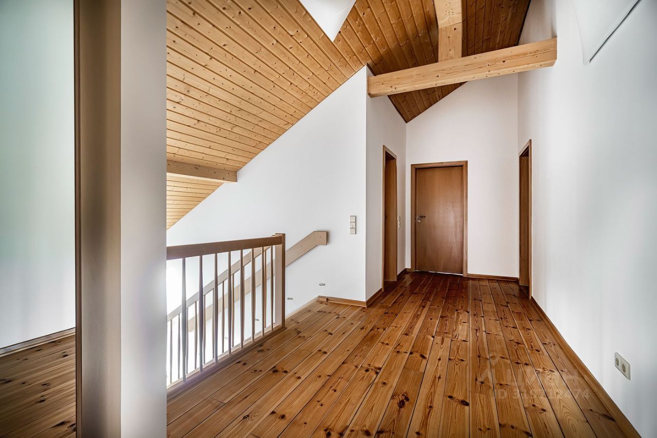 Интерьер выполнен в светлых тонах и преимущественно из деревянных материалов, что придает дополнительное тепло и уют. Панорамные окна в пол и высокие потолки от 3 до 6 метров добавляют много света и визуально расширяют пространство.