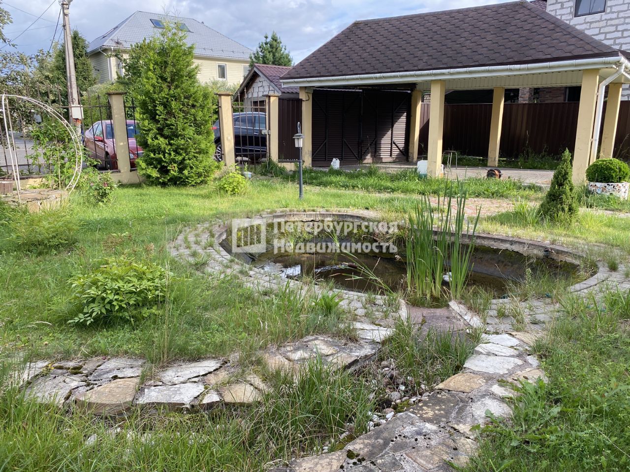 Участок сухой, ровный с декоративным фонтаном, навесом для автомобиля, хозблоком и теплицей.