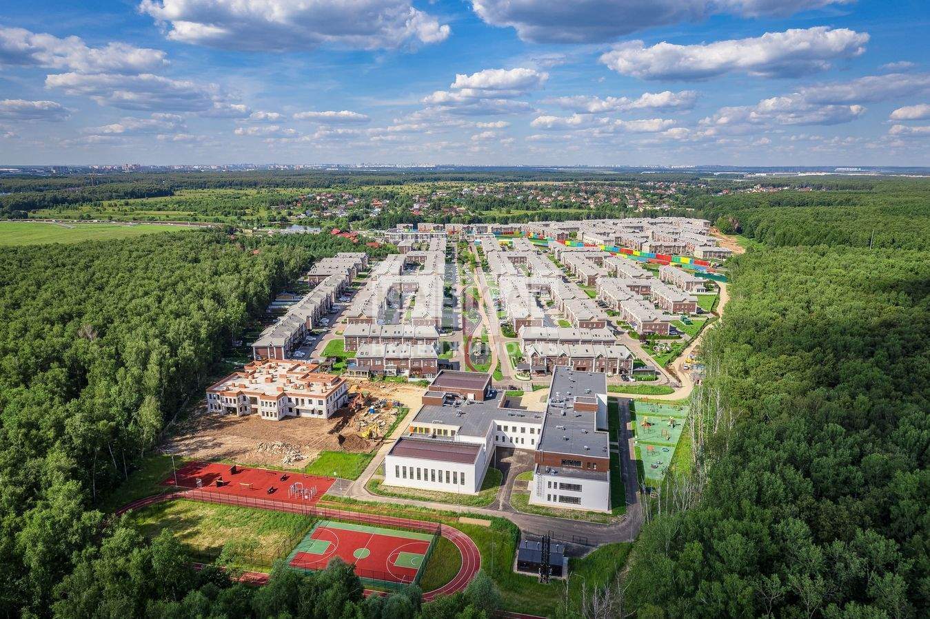 Таунхаус располагается в первой очереди строительства, здесь же находится вся нужная и необходимая инфраструктура: государственная общеобразовательная школа и детский садик, магазины (Пятёрочка, Вкус Вилл, Мясной двор, Ароматный мир) , аптека, кафе, салон красоты, детский центр, сервисы доставки (WB, OZON, Yandex Market)