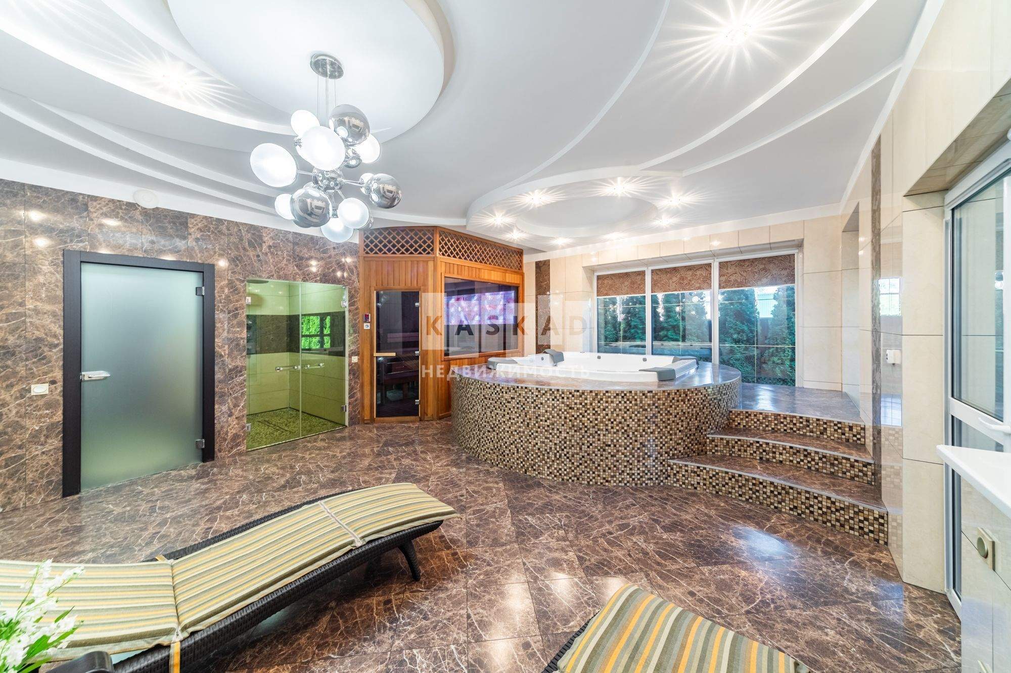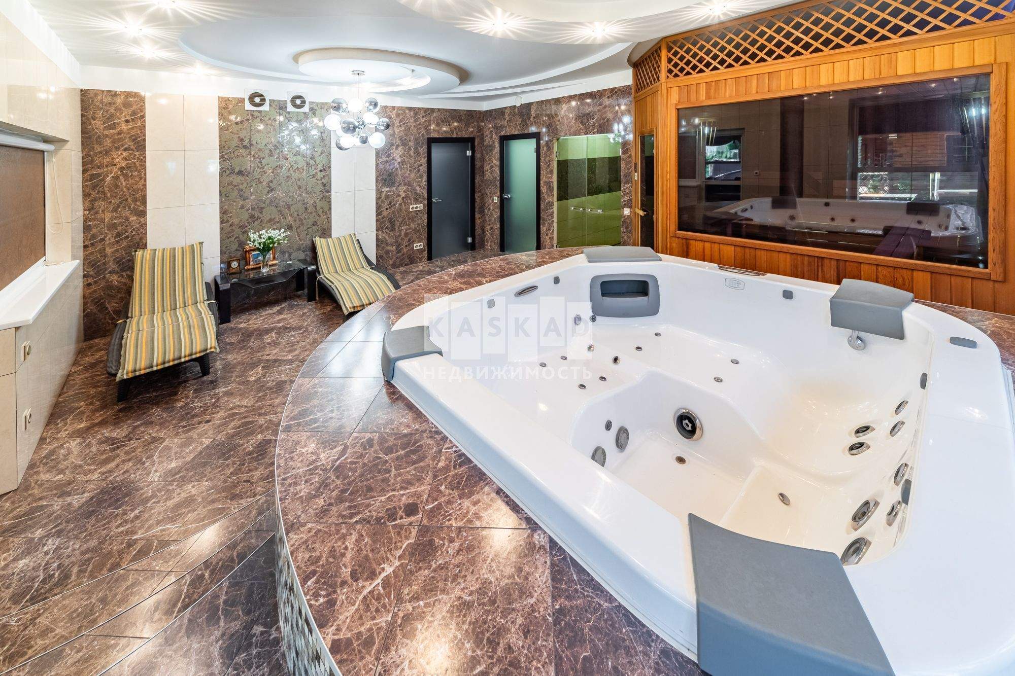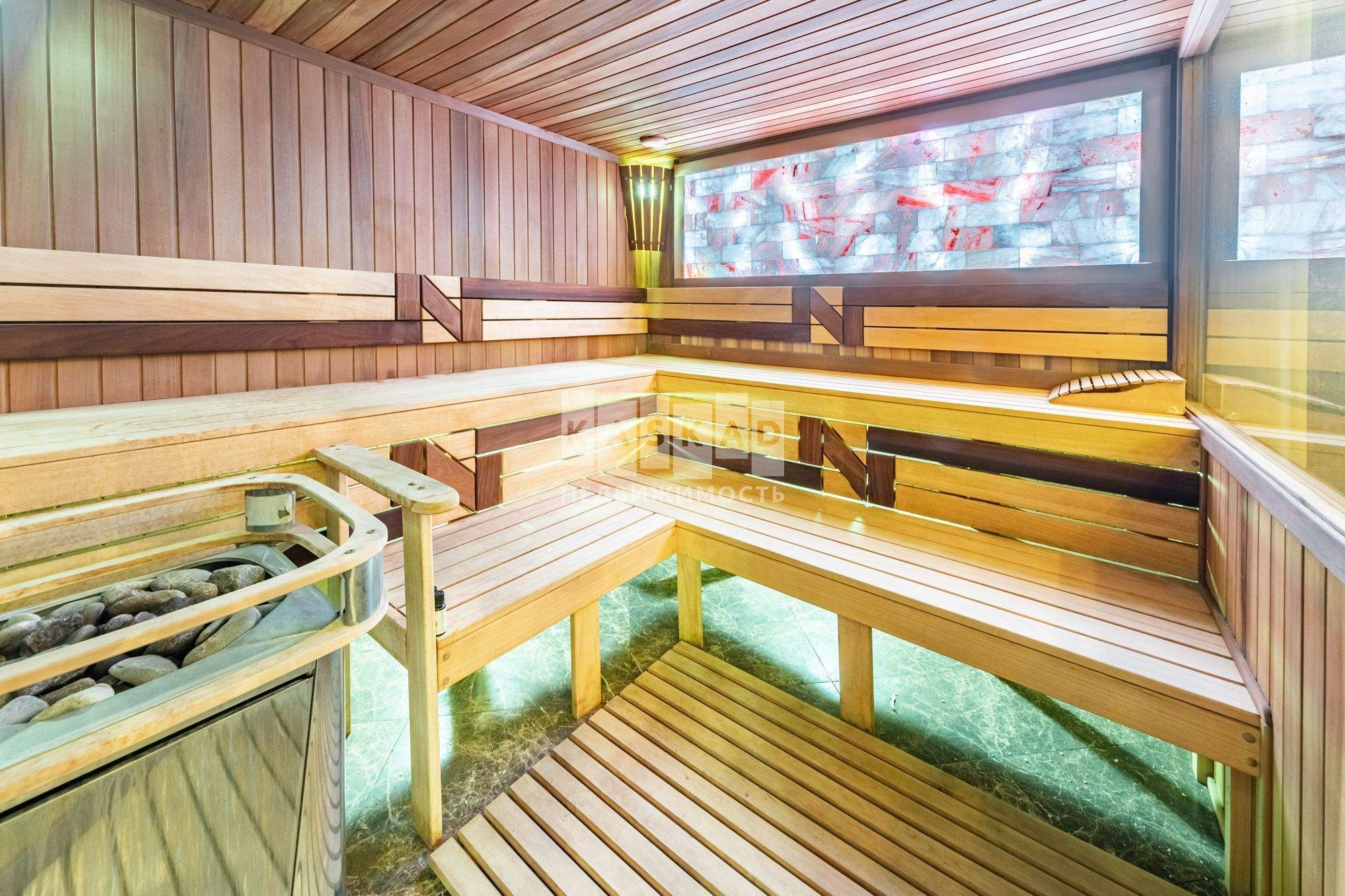 Просторная сауна мощностью 20 кВт с отделкой из канадского кедра - идеальное место для отдыха и релаксации.