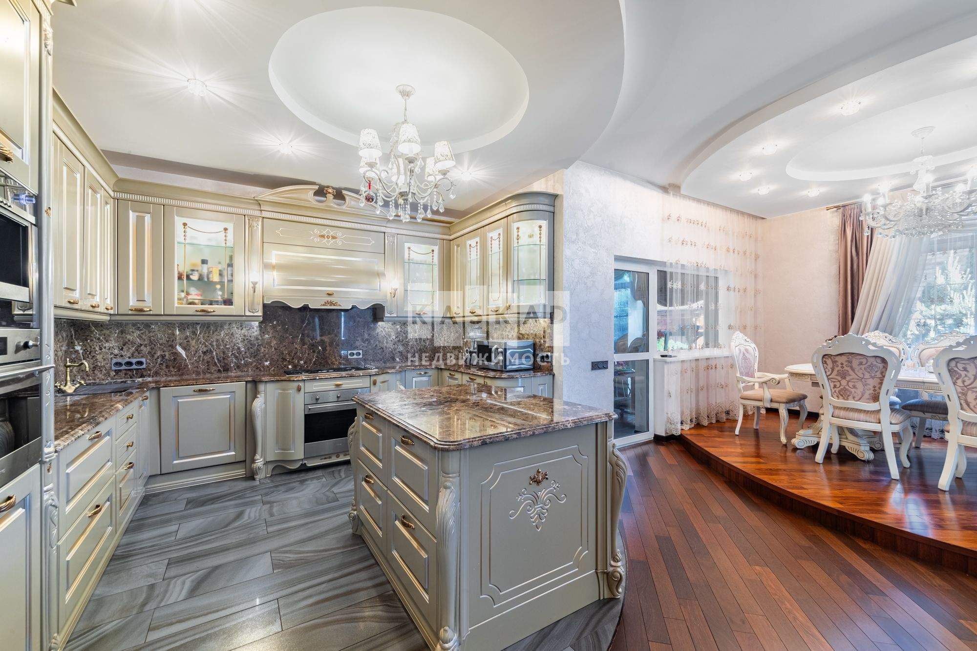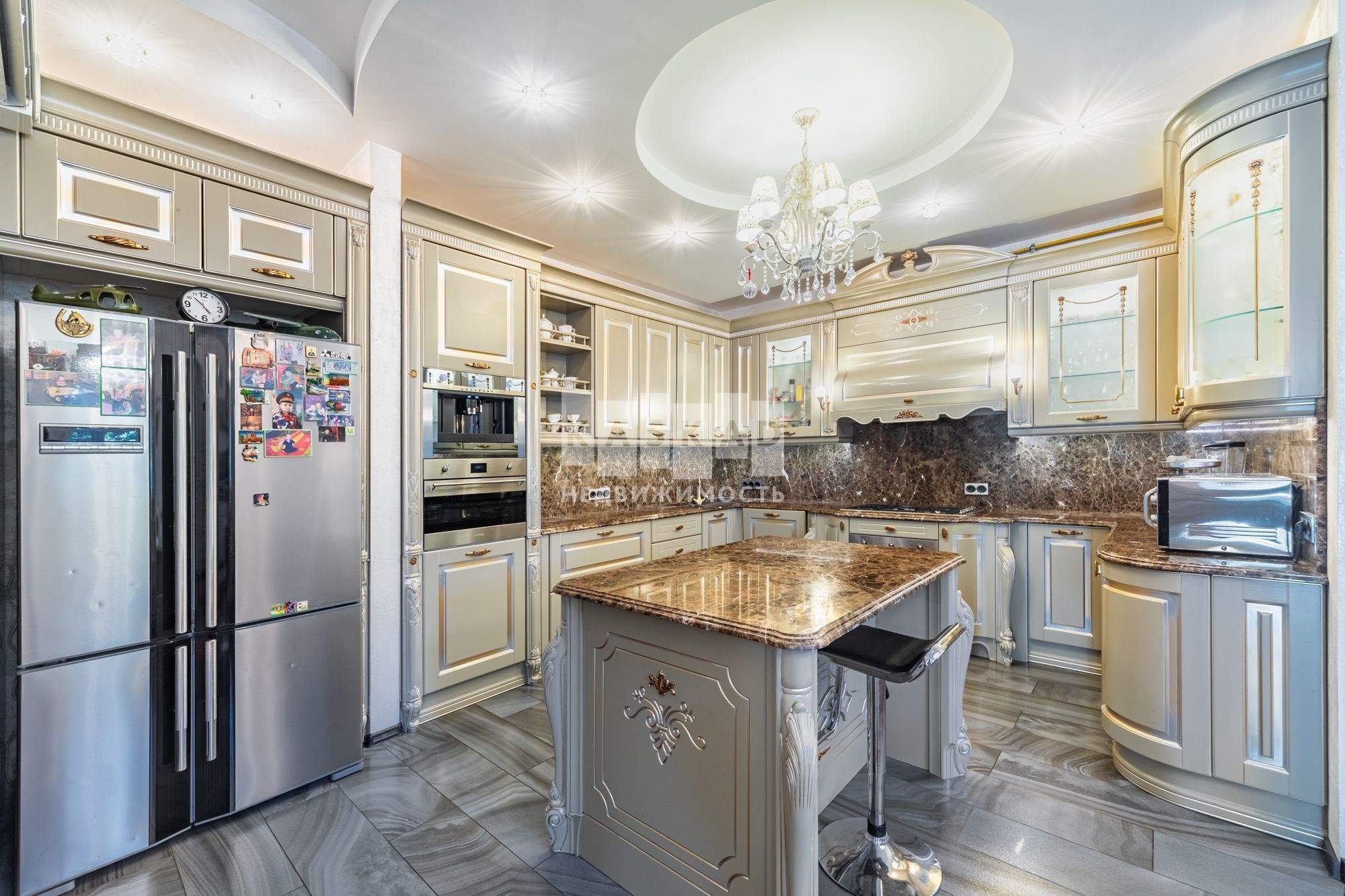 Кухня Tomassi Cucine (самая дорогая модель фабрики) с фасадами премиум-класса и столешницей из мрамора Dark Emperador. Вся кухонная техника бренда Smeg.
