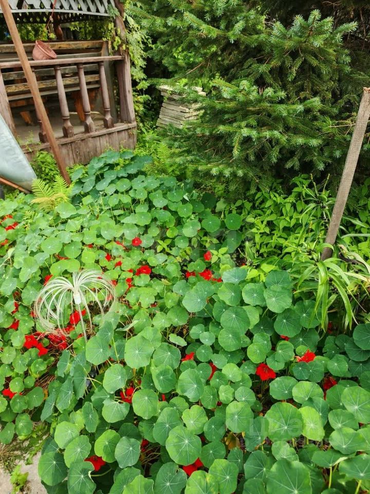 много насаждений цветов, растет виноград и калина.