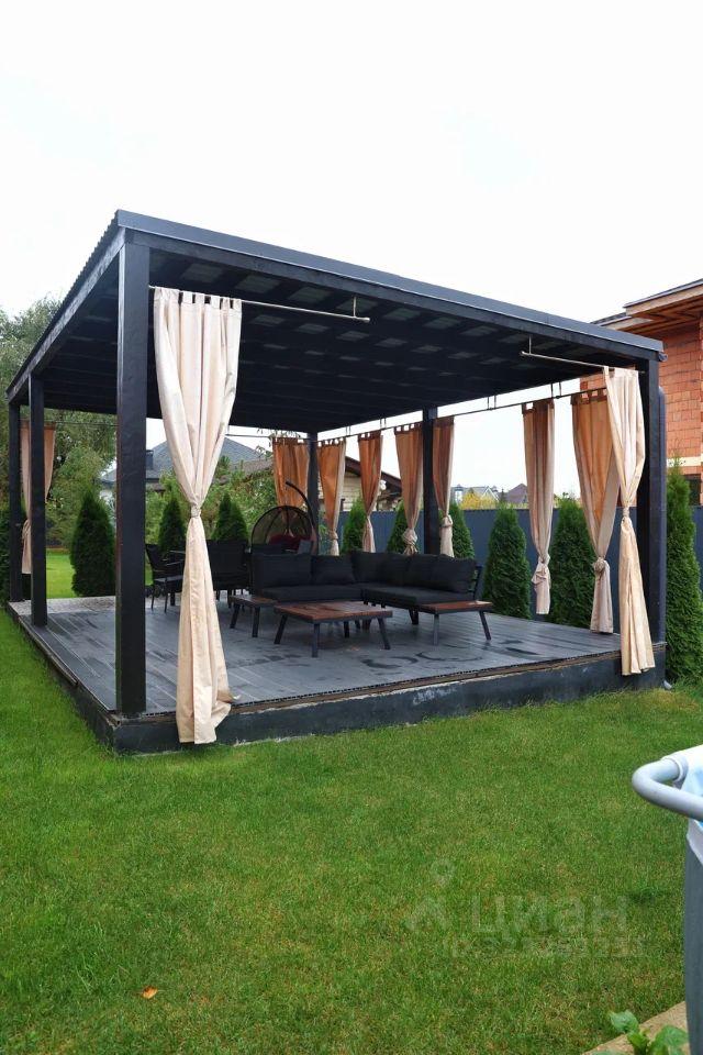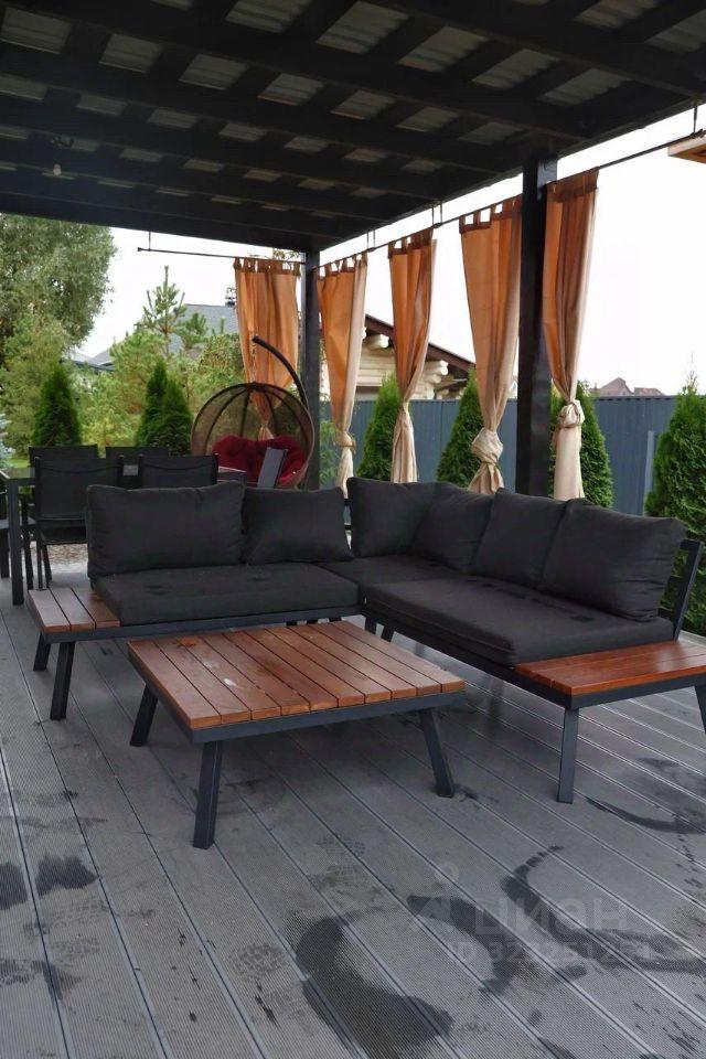 Просторная беседка с мебелью для отдыха: диваном, журнальным столиком и обеденным столом.