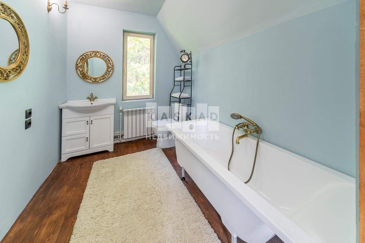 На втором этаже, на который ведет красивая лестница, оборудована большая мастер спальня, детская и кабинет . В совмещенном санузле расположена ванна.
