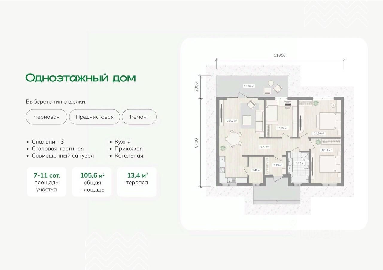 - 3 спальни + кухня-гостиная 29 м2