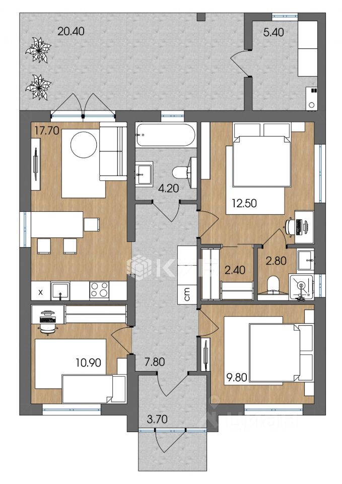 - Дом имеет просторную кухню-гостиную 17.7 м2, мастер-спальню (хозяйская) с гардеробной и санузлом, две обычных спальни, ванную комнату, большую террасу 20.4 м2.