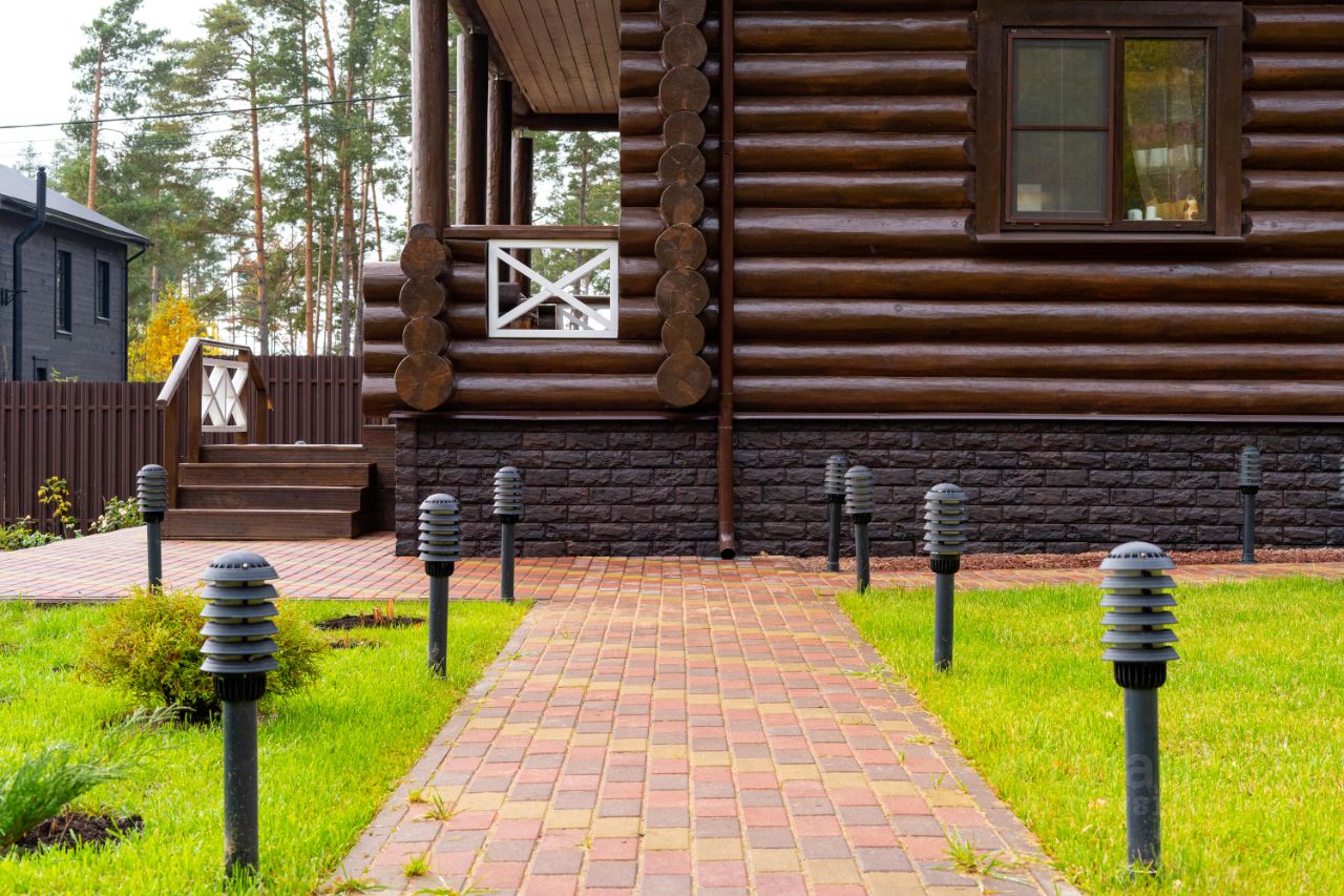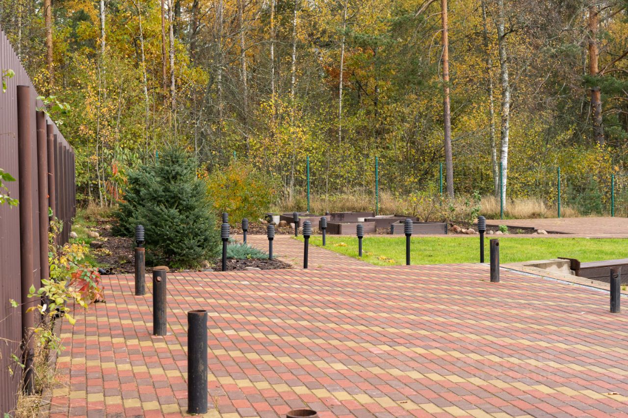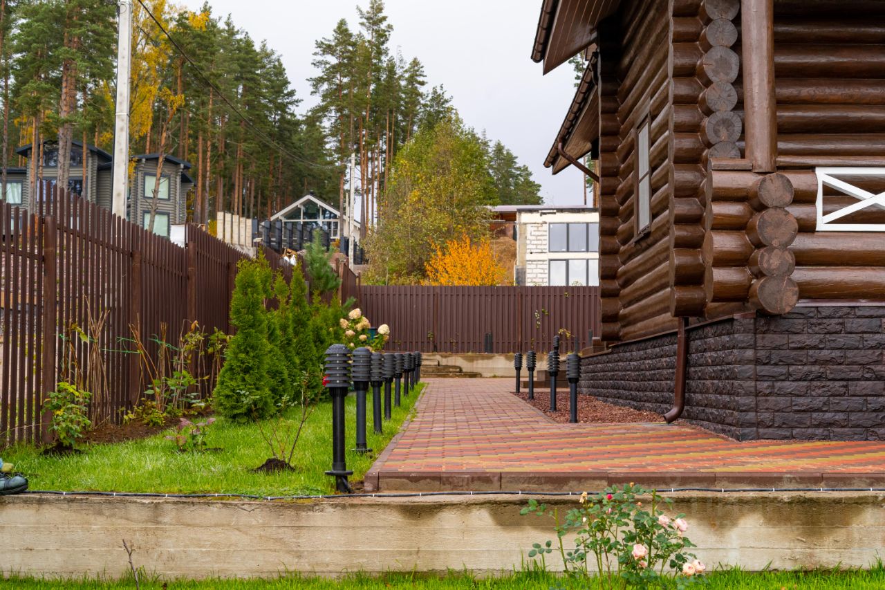 Вдоль дорожек установлены уличные фонари ( основа сваи). Дорожки вымощены. Продуманный ландшафтный дизайн участка.