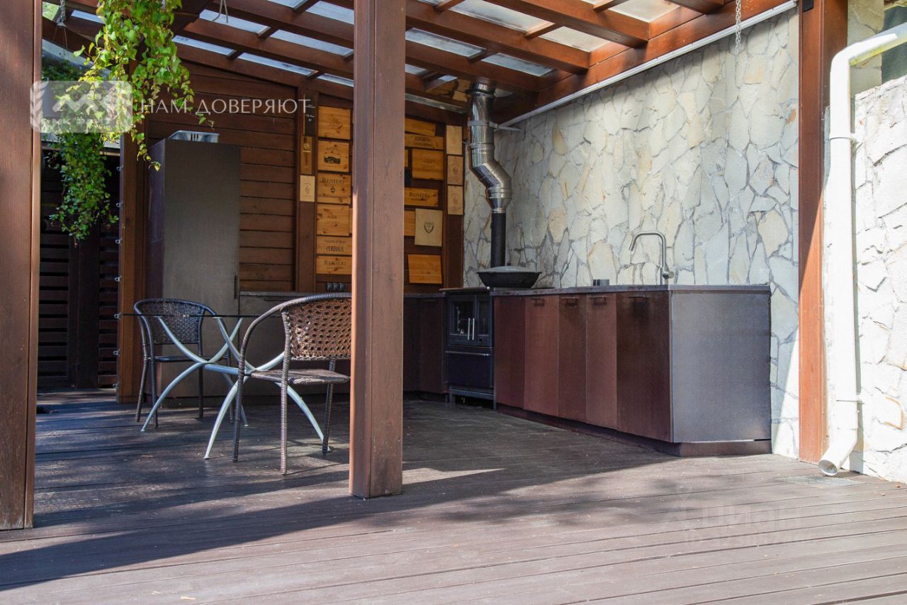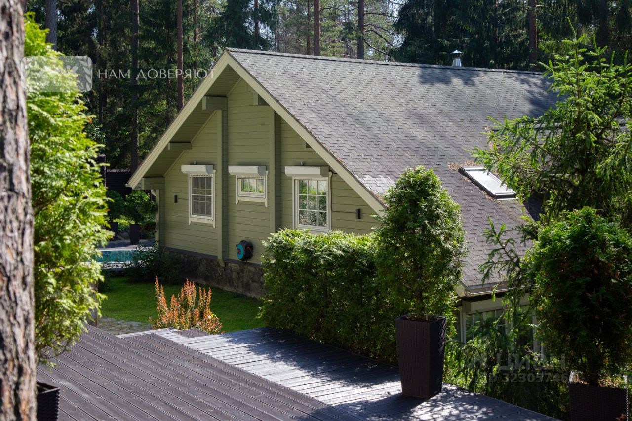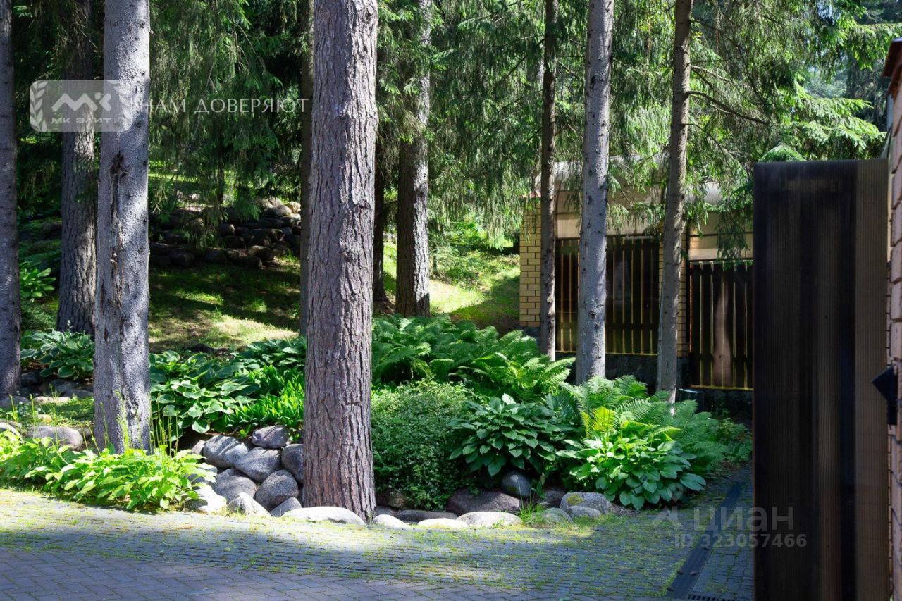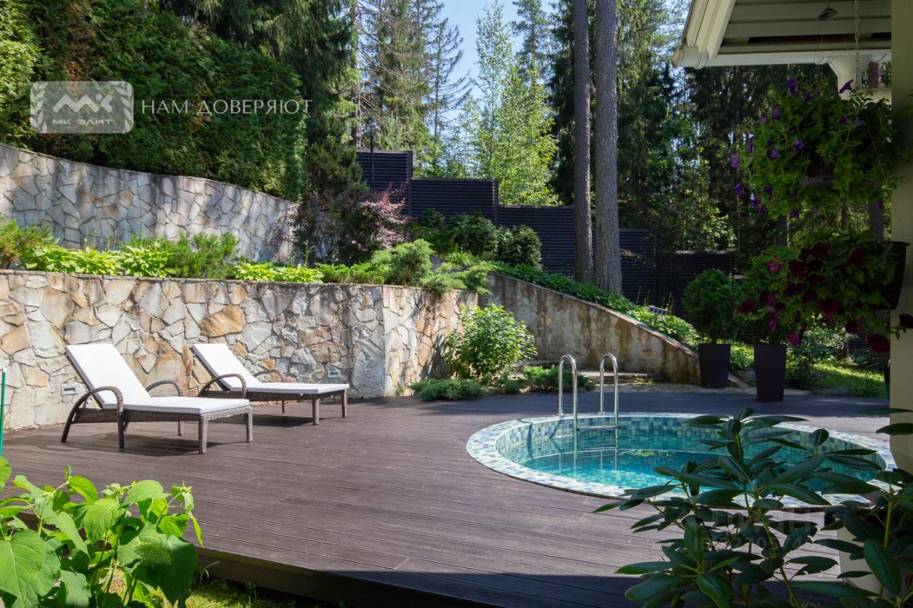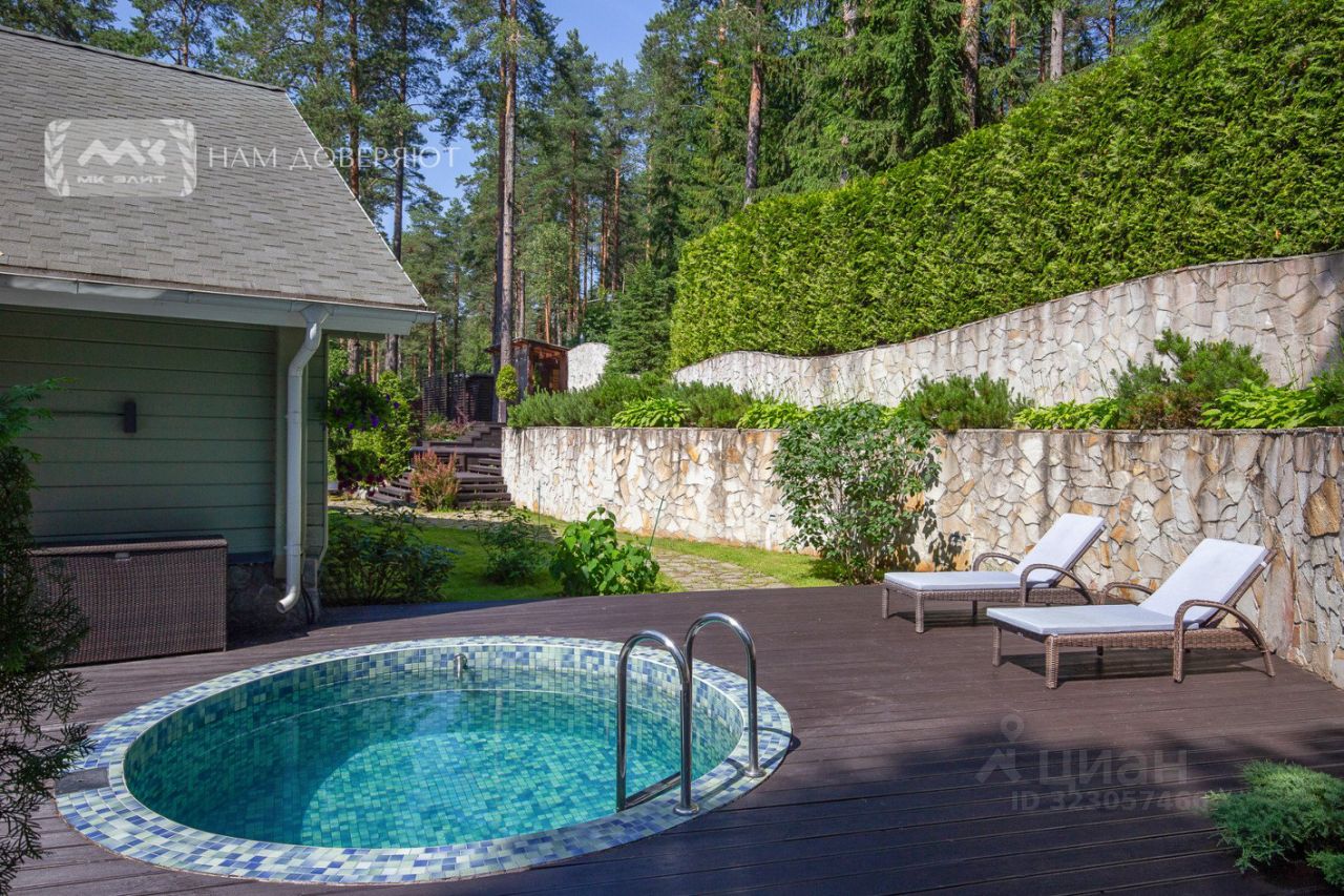 Участок 17 соток ИЖС, с холмистым ландшафтом и вековыми соснами. Обустроена отдельная крытая зона барбекю. Установлен открытый подогреваемый бассейн. На участке растёт вишня, черника и другие плодовые.