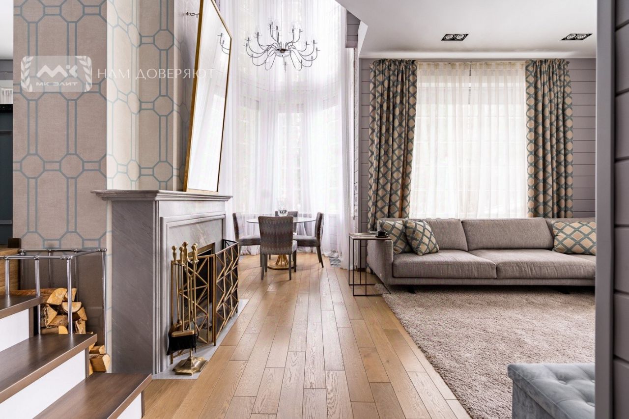 `Гостиная 30 м2 с камином и вторым светом высотой 5,5 метра;