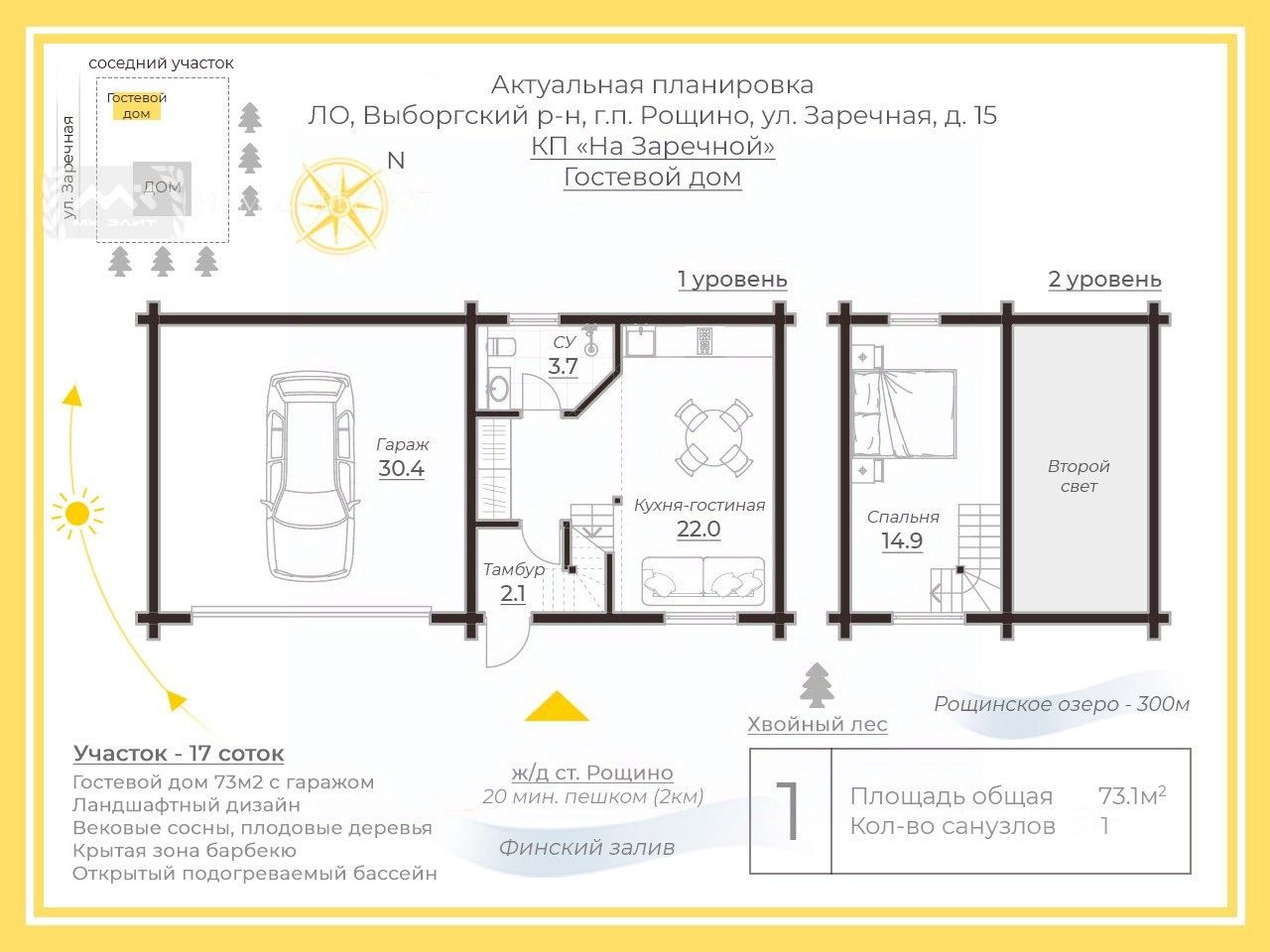 Также на участке располагается Гостевой дом 73м2, включающий в себя: