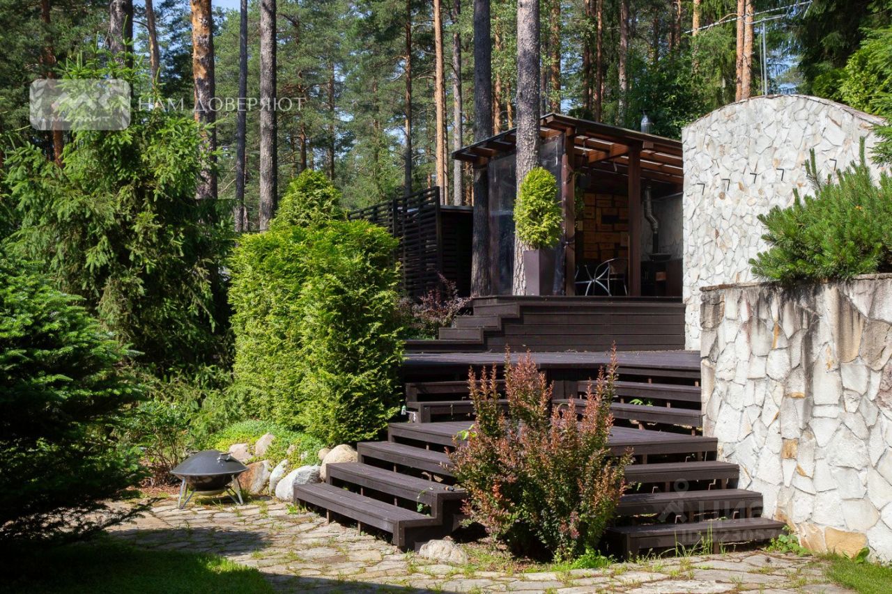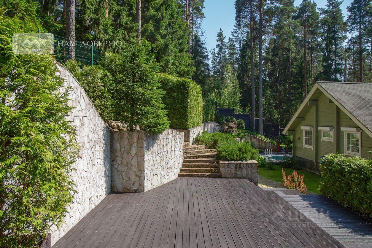Уникальность предложения в том, что дом находится на возвышенности, и занимает крайнее местоположение: с трёх сторон сосны и ели, и лишь с одной - соседи, которых не видно благодаря каскадной изгороди.