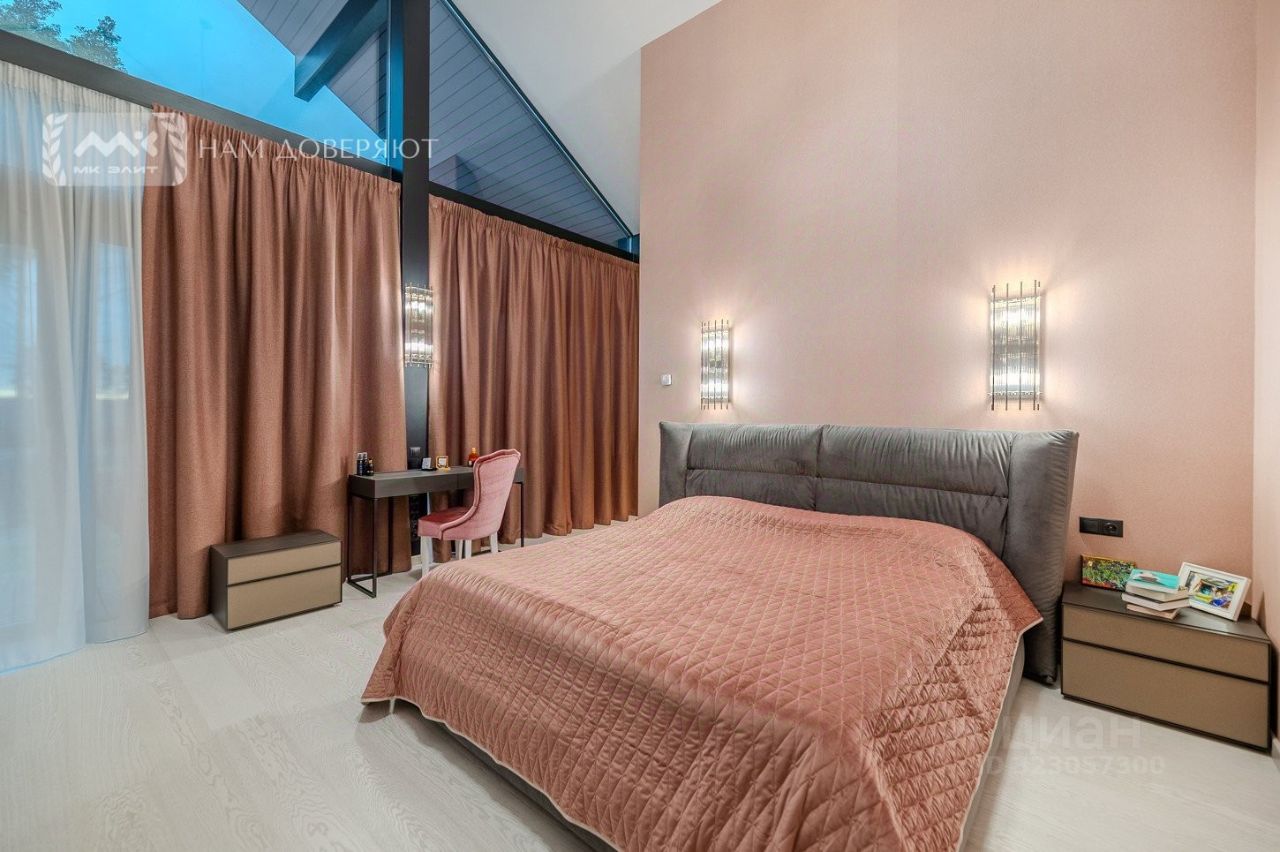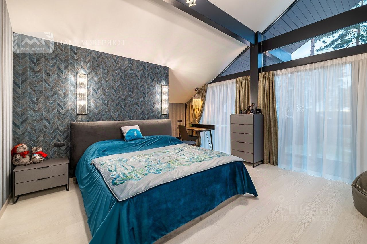 На 2 этаже мастер-спальня 20,4 кв.м (с собственным санузлом с ванной и душевой 8,3 кв.м и гардеробной 4,4 кв.м), две спальни с гардеробными. Из каждой комнаты есть собственный выход на балкон и вид на озеро.