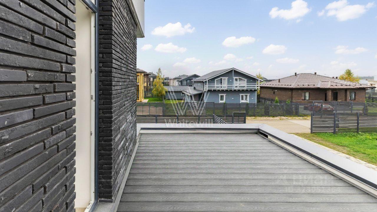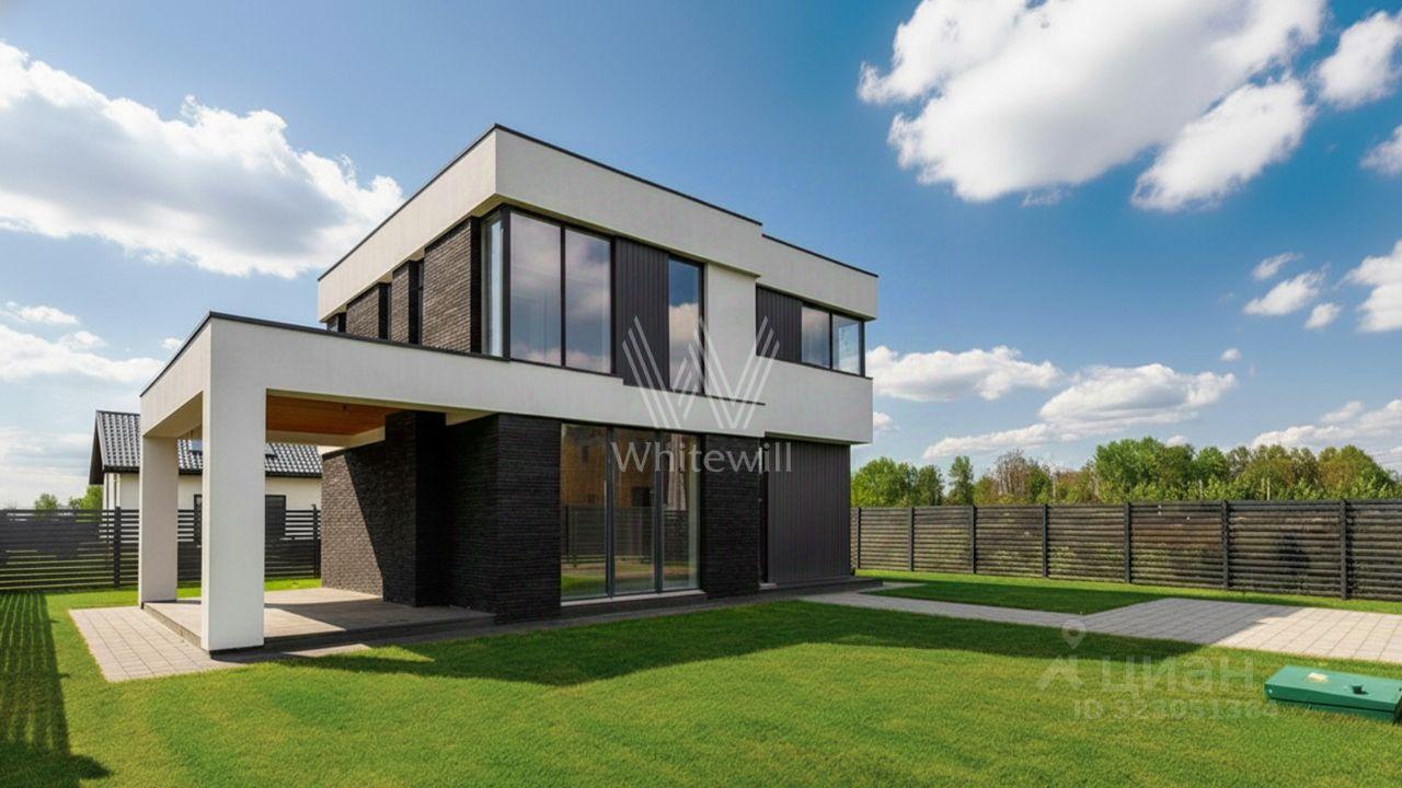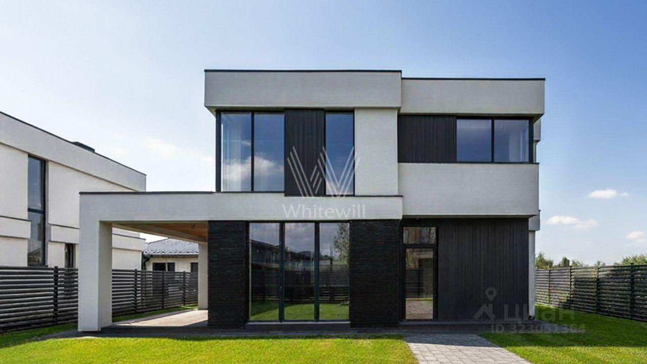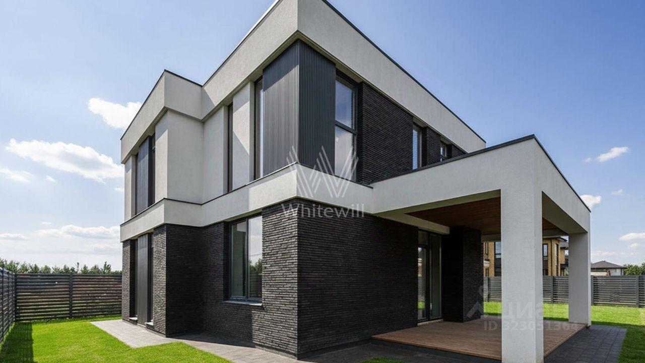Аносино Парк. Загородный коттедж площадью 190 м² расположен на полевом участке 6 соток. Современный фасад облицован белоснежной штукатуркой, благородным ригельным кирпичом и высококачественными тёмно-серыми панелями, напоминающими планкер. Большие окна наполняют внутренние пространства солнечным светом и теплом, создавая приятную атмосферу. Отсутствие отделки позволяет будущим владельцам реализовать любой дизайн-проект.
