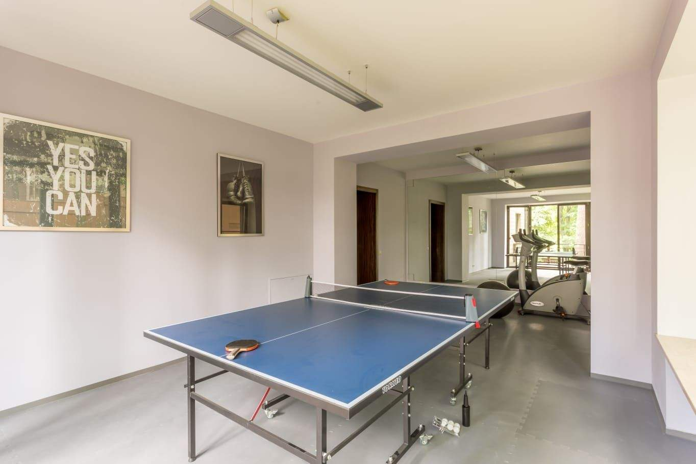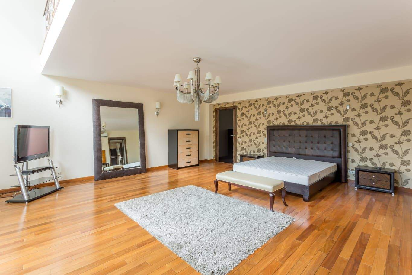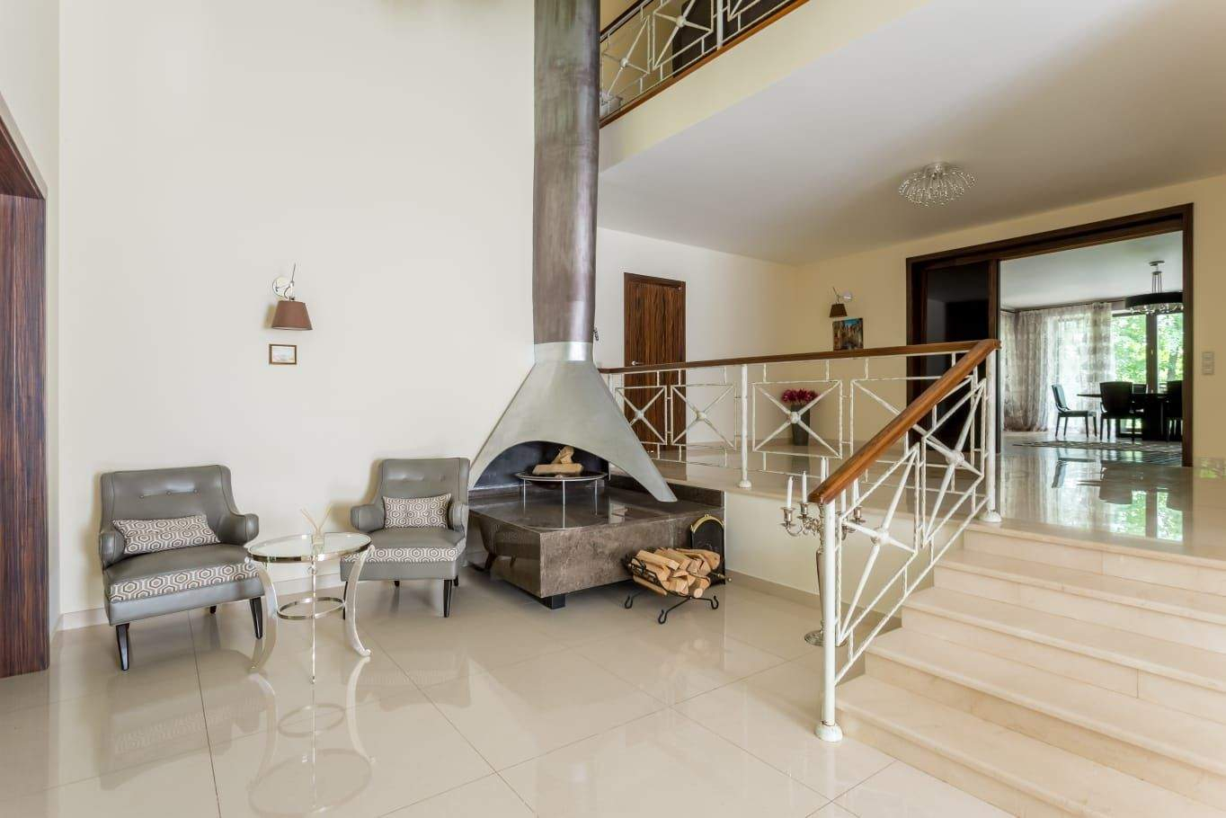 Цоколь: бассейн, сауна, комната отдыха, кладовая и технические помещения. 1-й уровень: гостиная с камином, кухня, столовая, терраса, 2 гостевые спальни и тренажерный зал. 2-й уровень: несколько спален с индивидуальными гардеробными и санузлами, кабинет, библиотека, детская игровая, комната для обслуживающего персонала и комната отдыха. Мансарда: небольшая спальня с санузлом и кинотеатр.