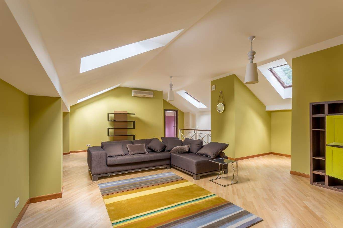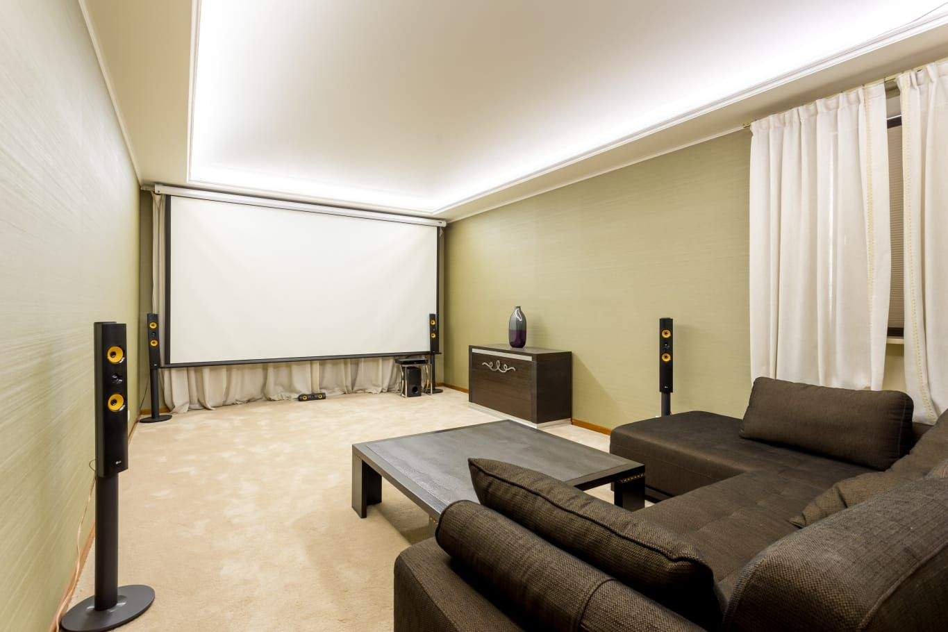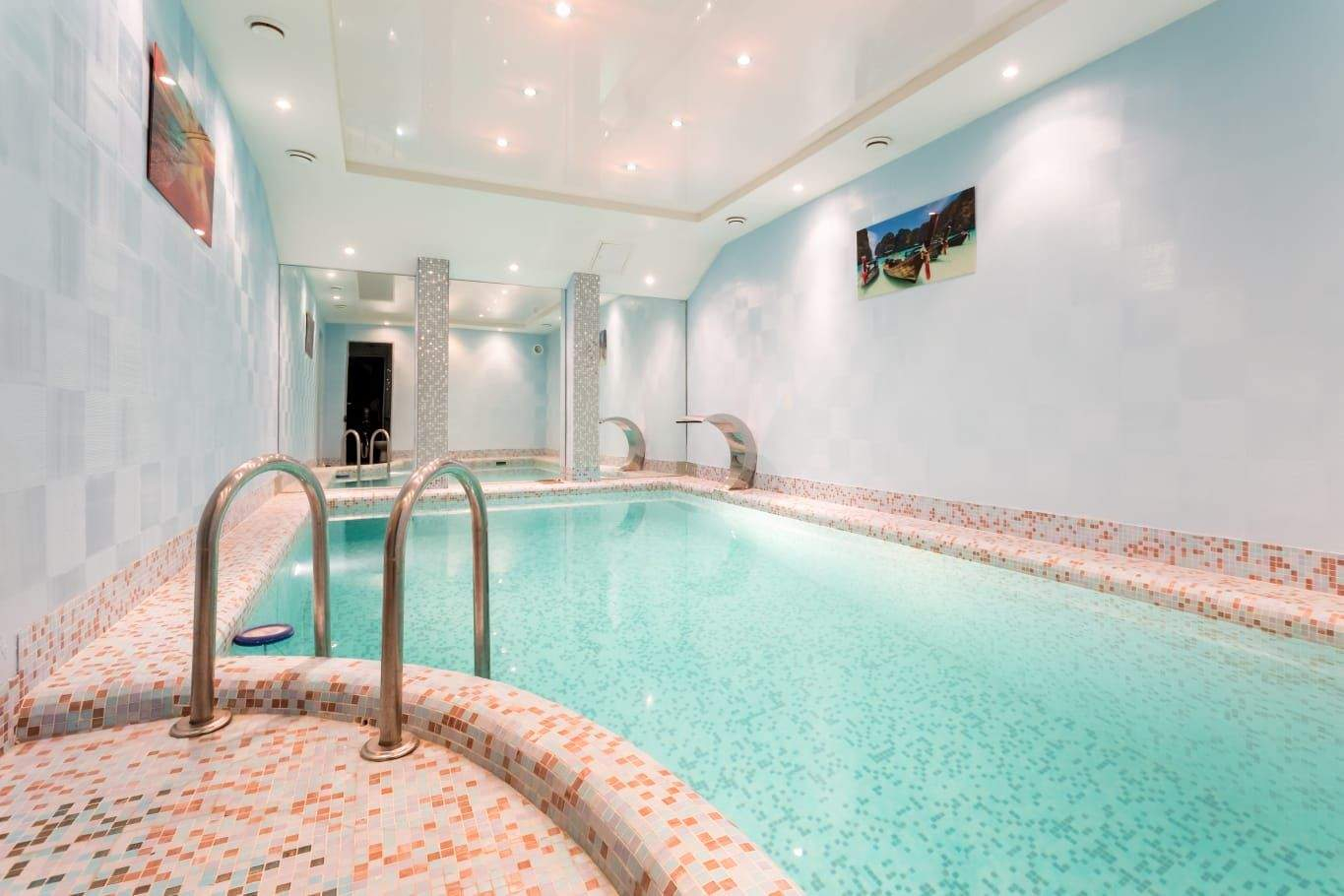 Цоколь: бассейн, сауна, комната отдыха, кладовая и технические помещения. 1-й уровень: гостиная с камином, кухня, столовая, терраса, 2 гостевые спальни и тренажерный зал. 2-й уровень: несколько спален с индивидуальными гардеробными и санузлами, кабинет, библиотека, детская игровая, комната для обслуживающего персонала и комната отдыха. Мансарда: небольшая спальня с санузлом и кинотеатр.