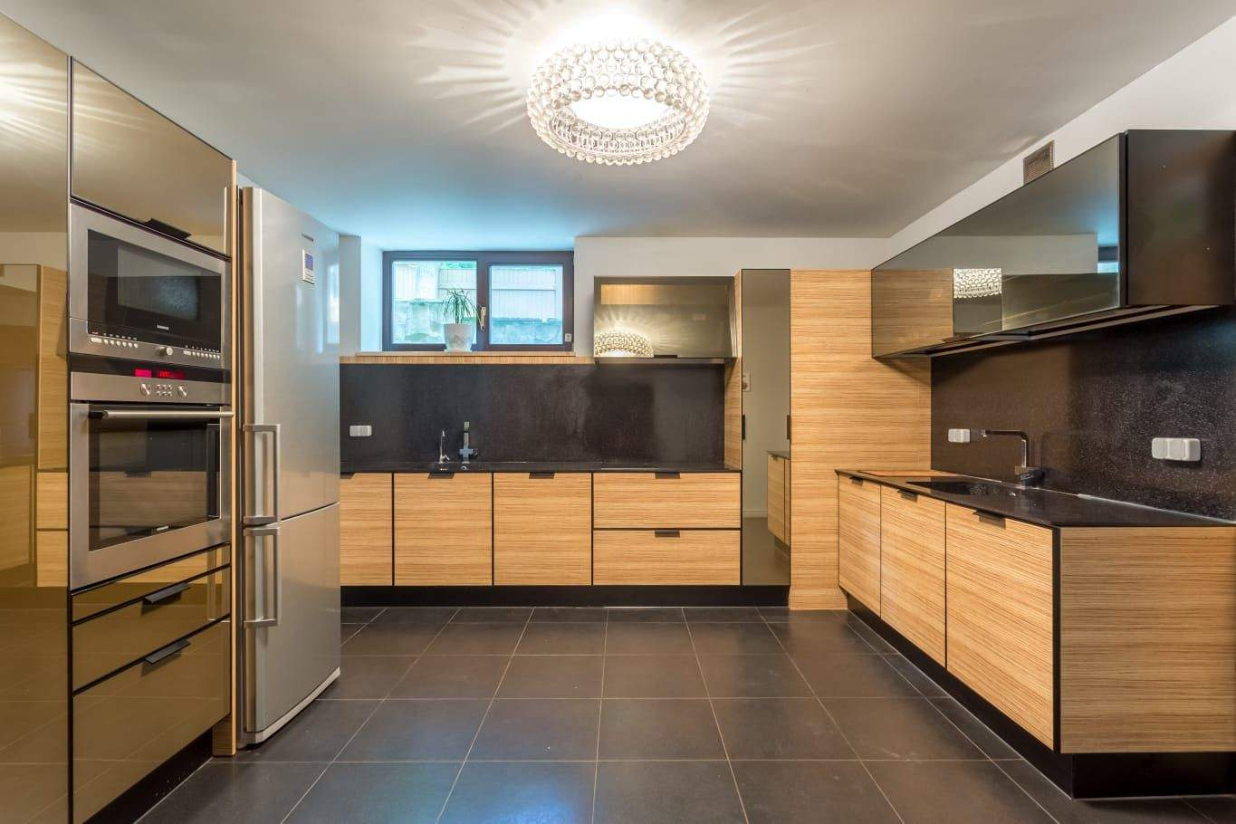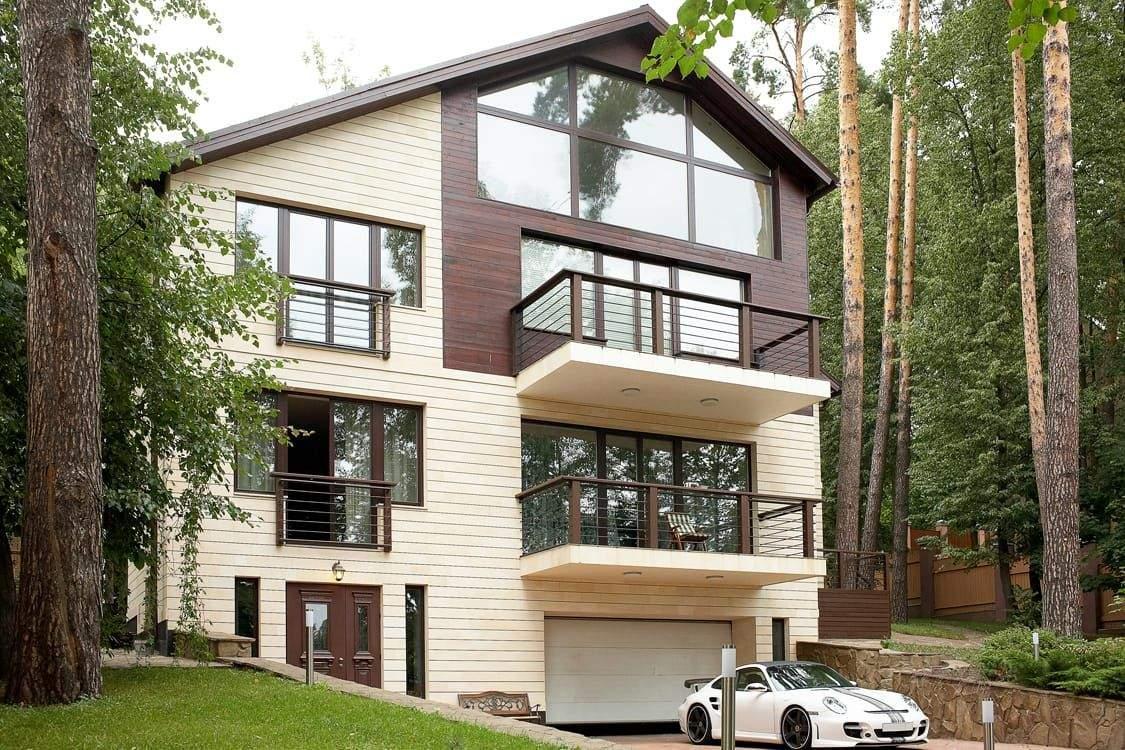 Большой двухэтажный дом 822 м в современном стиле построен на лесном участке с сильным перепадом высот. Фасад с панорамными окнами и балконами облицован темным деревом и светлыми панелями. Цокольный этаж дома занимает бассейни встроенный гараж с прямым выездом на лицу. В гостиной с камином спланировали второй свет - за счет этого помещение кажется очень просторным. На втором и мансардном этаже разместили спальни хозяев и тренажерный зал.