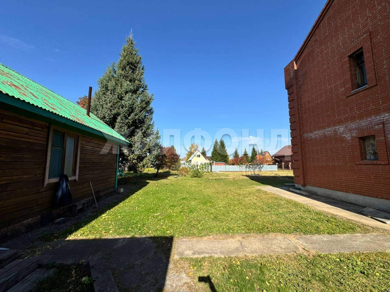Участок ровный, с лужайкой и садом.
