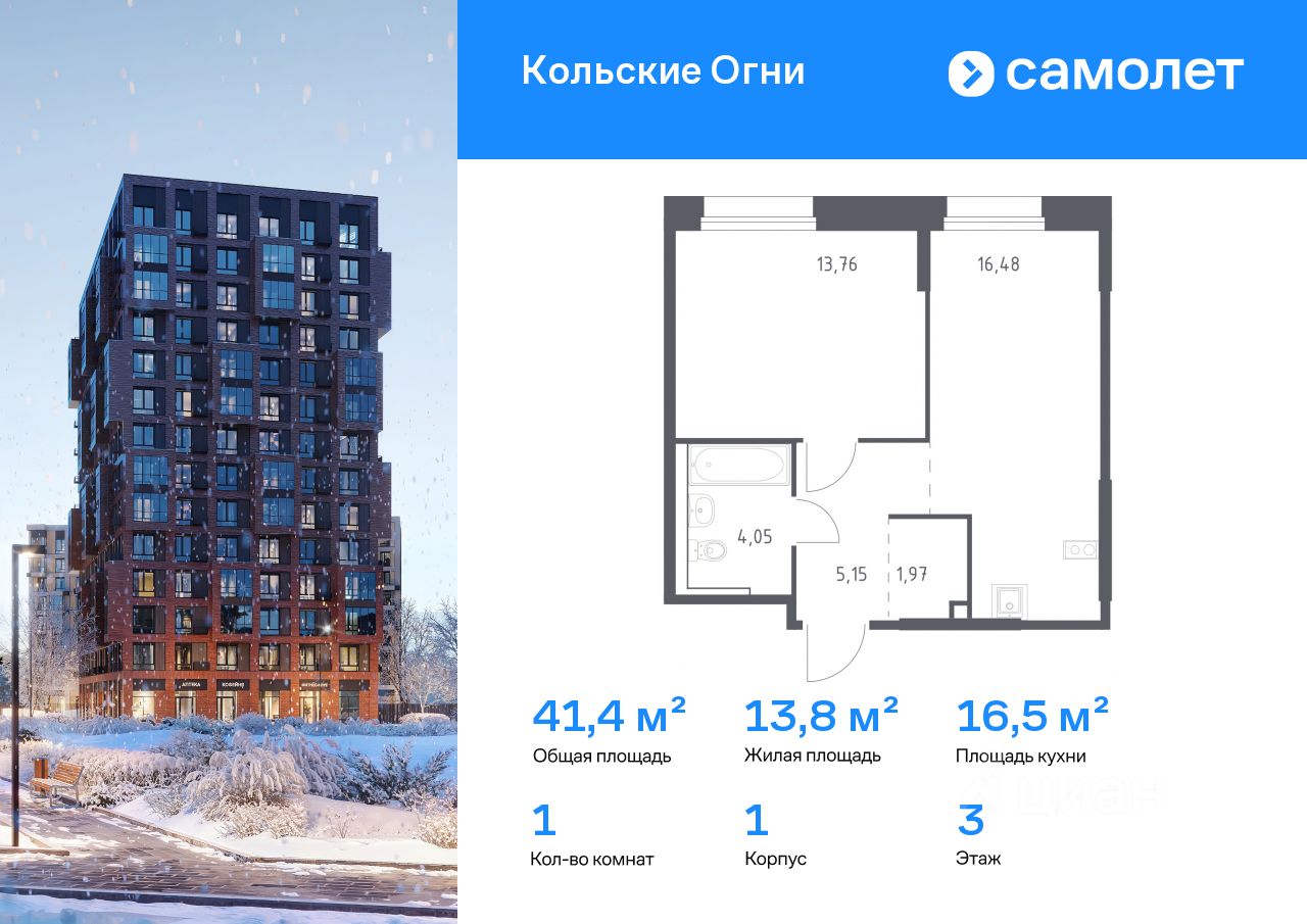 Строим кварталы для жизни с заботой о будущем. Предлагается 1-комнатная квартира комфорт-класса 41,41 кв.м в корпусе 1 на 3 этаже, в ЖК "Кольские Огни" Квартира без отделки. Доступность опции...