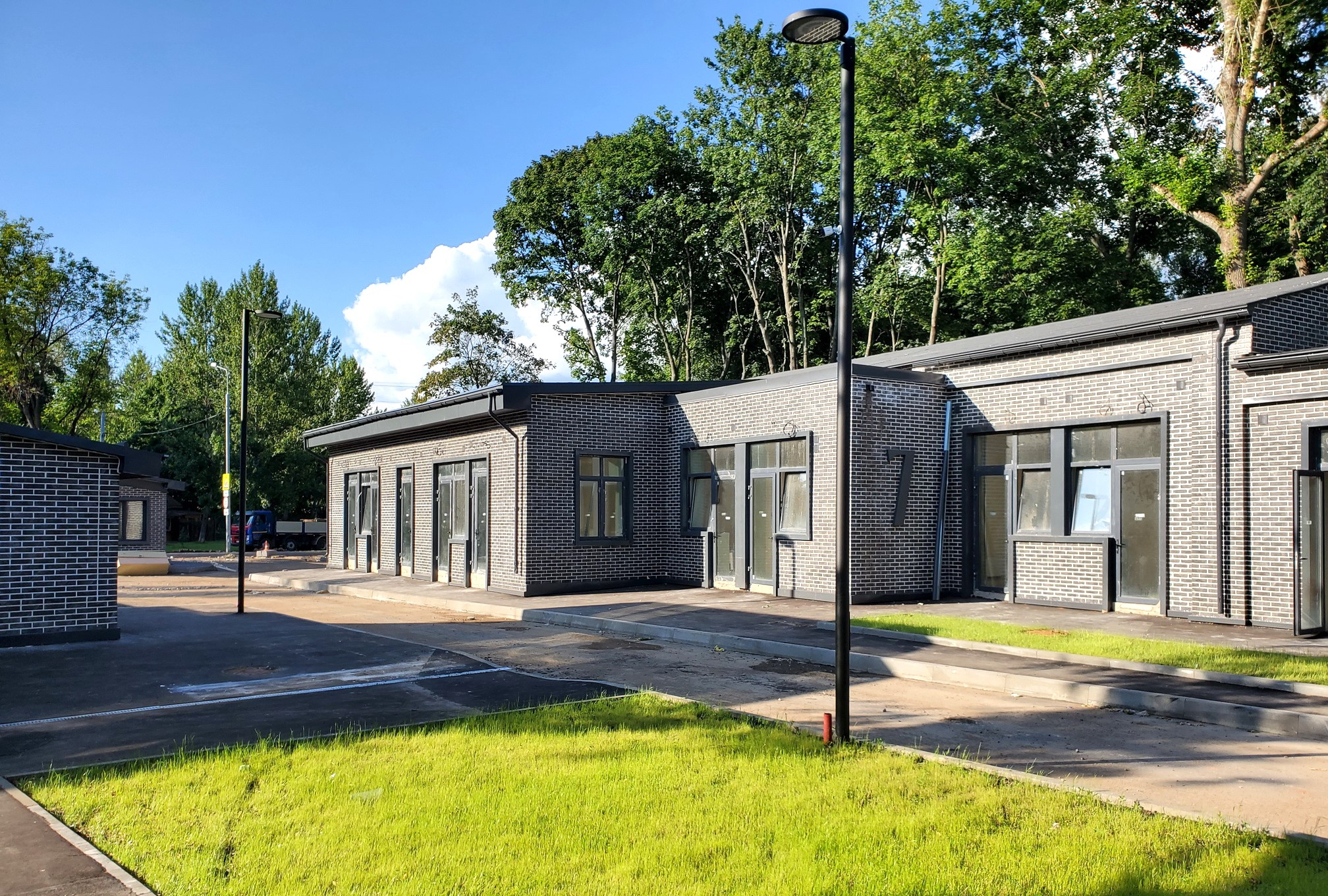 Отделка фасадов выполнена панелями с имитацией клинкерного кирпича. Дополнительно на территории организованы зоны отдыха на свежем воздухе, также дополнительно имеется возможность для организации летних веранд и кафе.