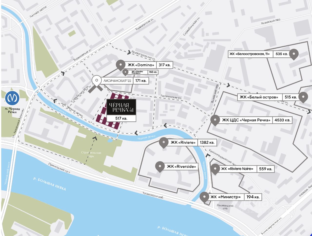 Вокруг плотная застройка: ЖК Ривьер Нуар, ЖК Риверсайд, ЖК Белый остров, ЖК Домино, ЖК Лисичанская 22, ЖК ЦДС Черная речка,а также множество бизнес-центров - 28 000+ жителей и более 11 000 сотрудников офисных и бизнес-центров.