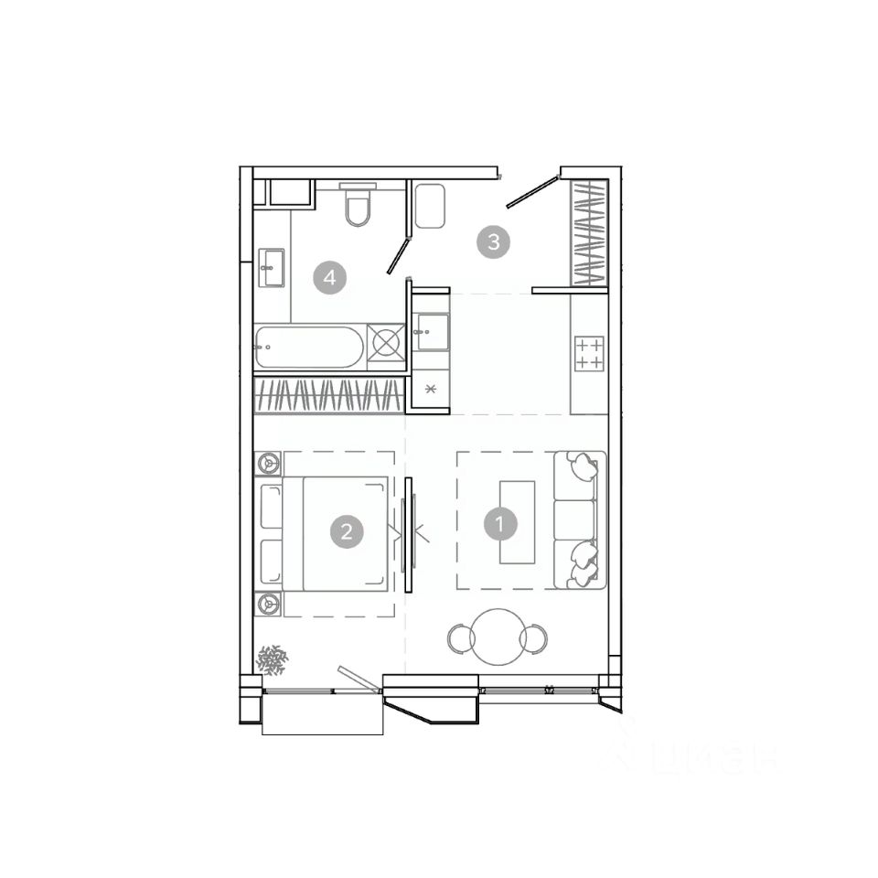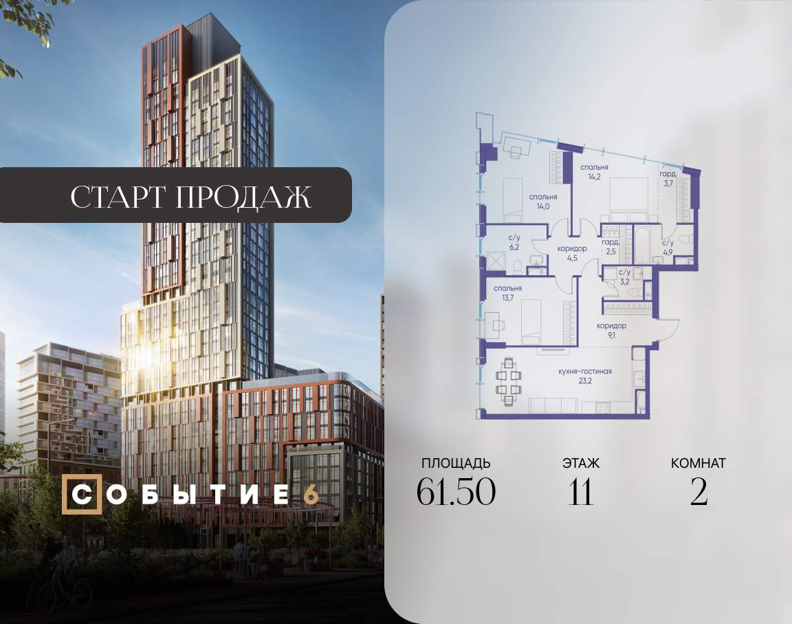 Продаётся 2-комнатная квартира в строящемся доме (Корпус 1), срок сдачи: IV-кв. 2028, общей площадью 56.37 кв.м., на 2 этаже.
