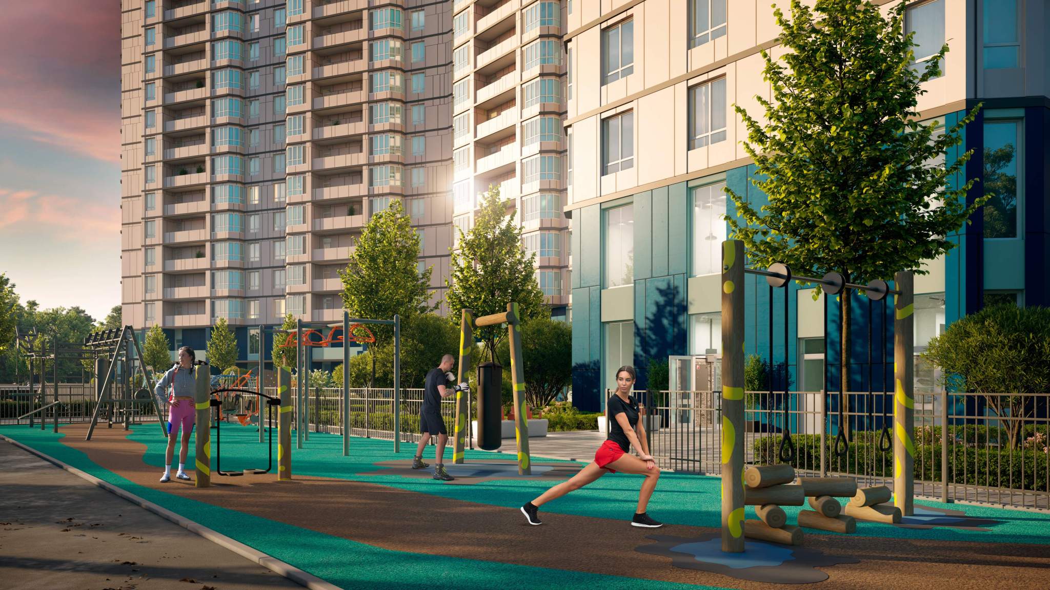 Отдельная многоуровневая парковка, парковка охраняется. Обеспечение безопасности: видеонаблюдение, противопожарная система. Инфраструктура: детский сад, детские площадки, спортивные площадки, места для отдыха, супермаркет, рестораны, фитнес-центр, пункты бытового обслуживания, коммерческие объекты.