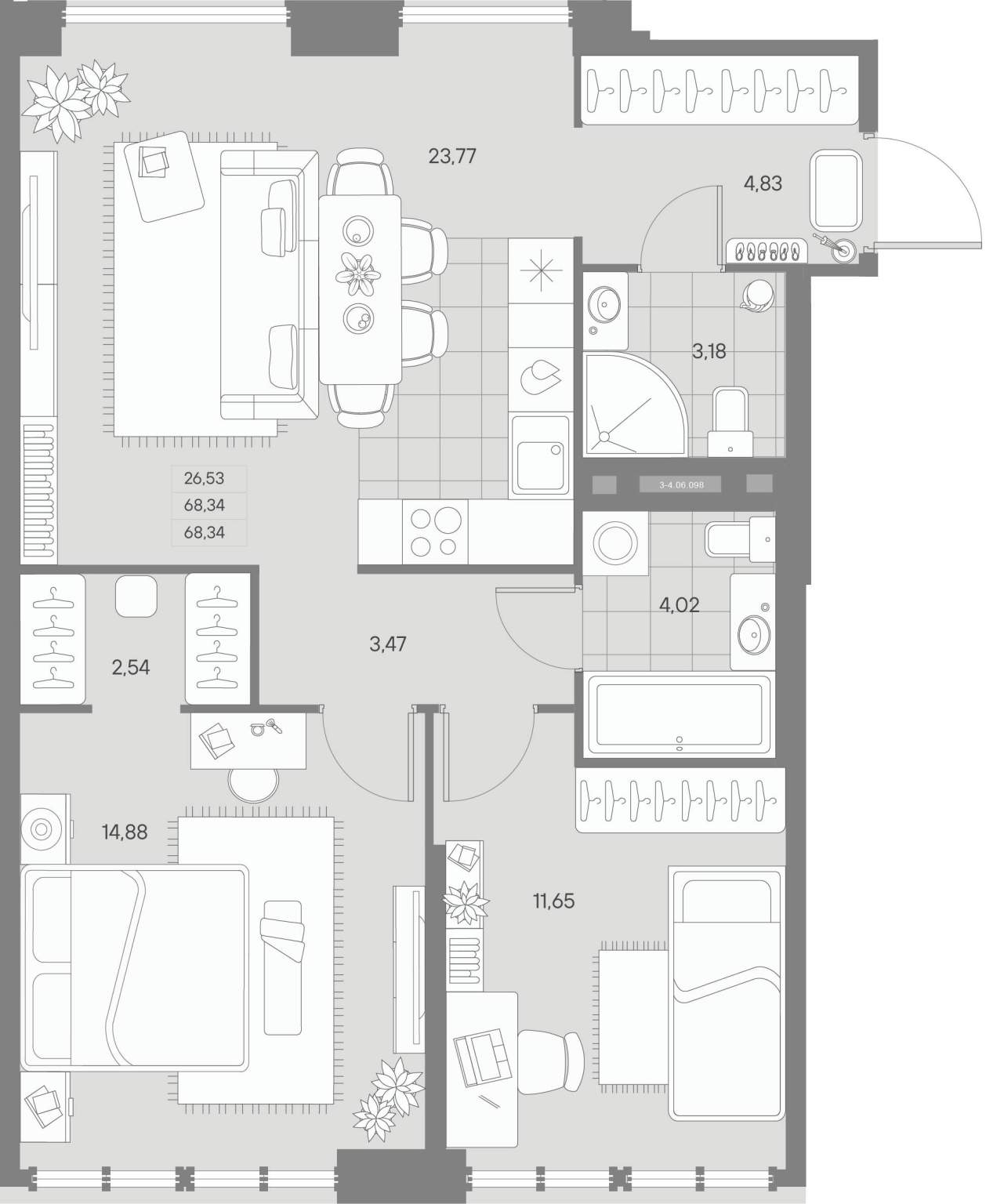 Жилая площадь 28.23 м2, кухня 19.94 м2, черновая отделка.