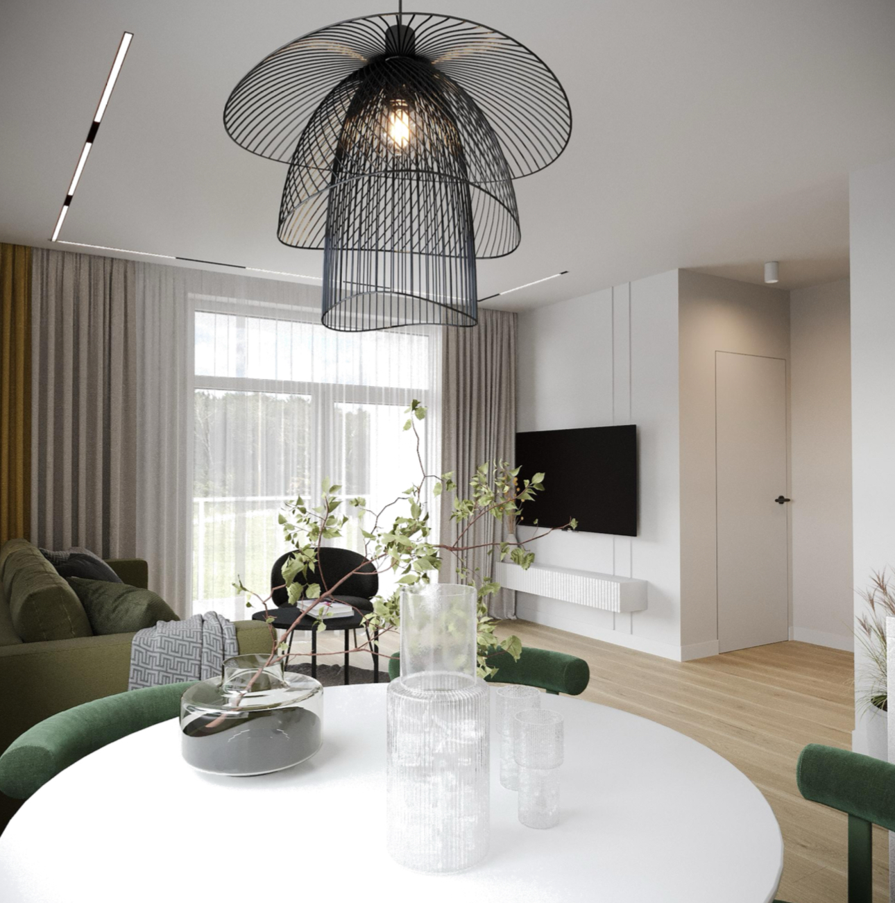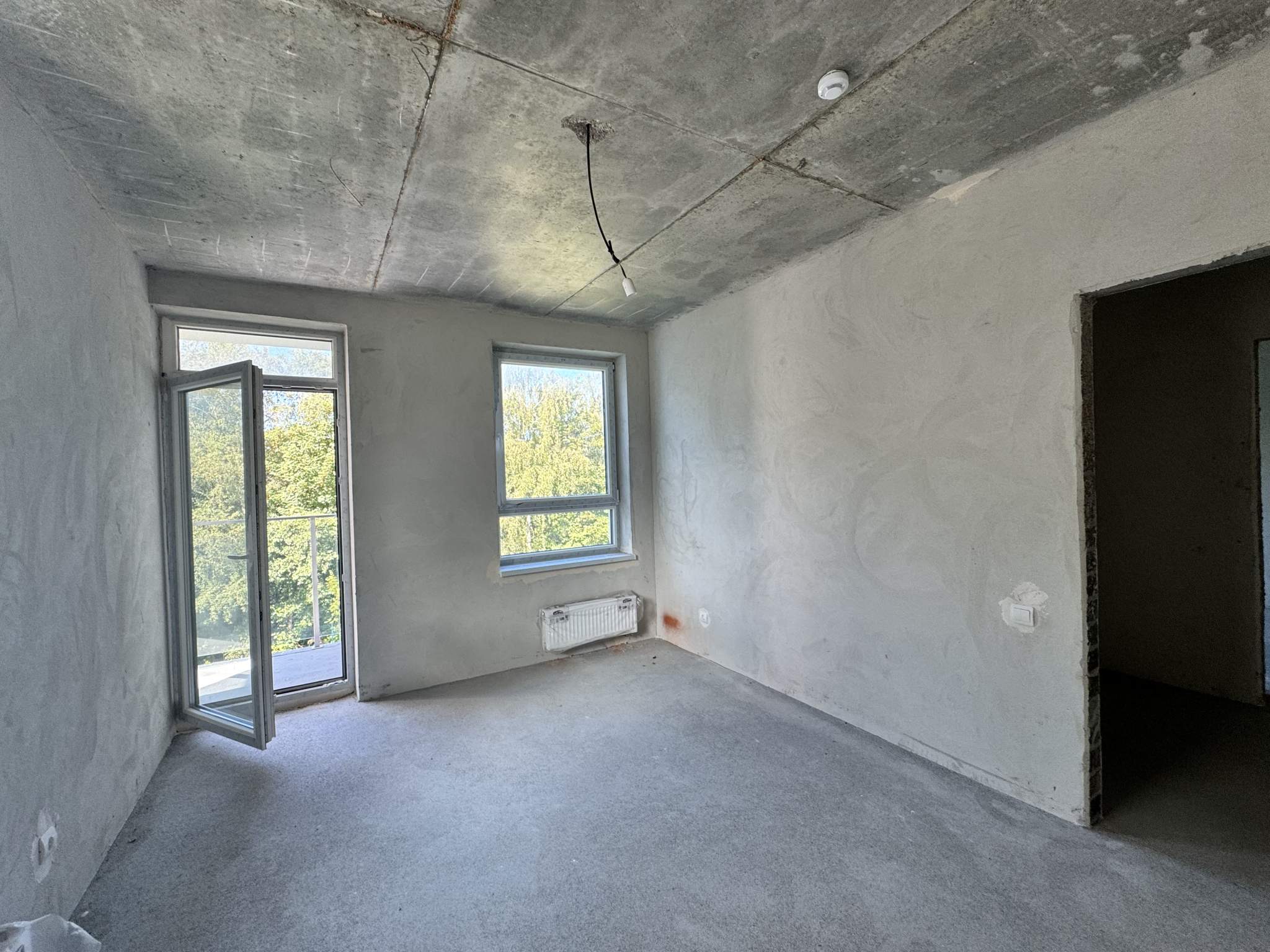На полу стяжка, 2 балкона, окна выходят во двор и на лесной массив.