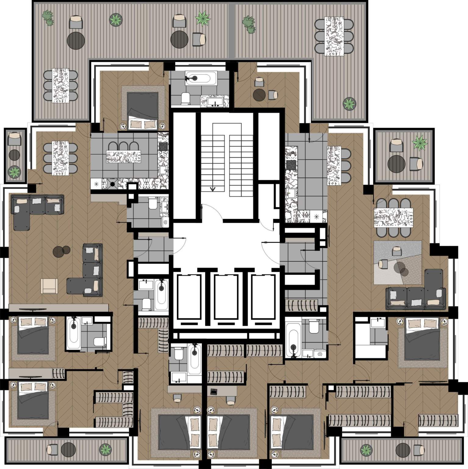 Квартиры с просторными террасами - выход на свежий воздух прямо из дома, гармония природы и городской роскоши.