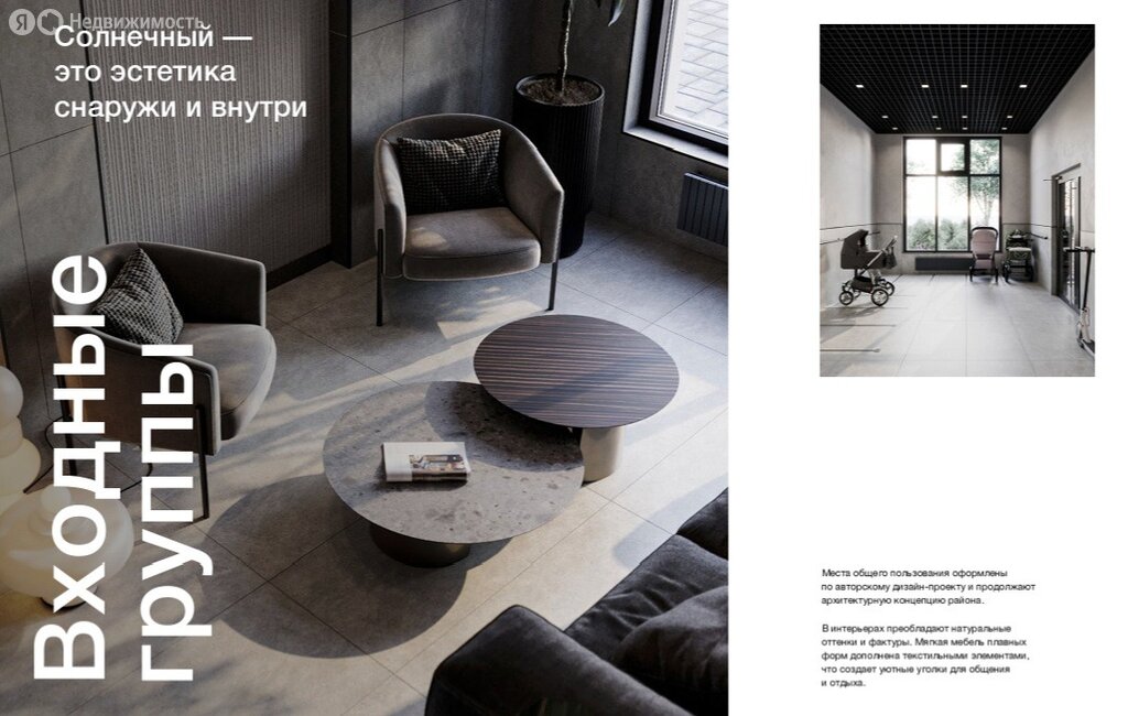 - Места общего пользования оформлены по авторскому дизайн-проекту и продолжают архитектурную концепцию района. В интерьерах преобладают натуральные оттенки и фактуры. Мягкая мебель плавных форм дополнена текстильными элементами, что создает уютные уголки для общения и отдыха.