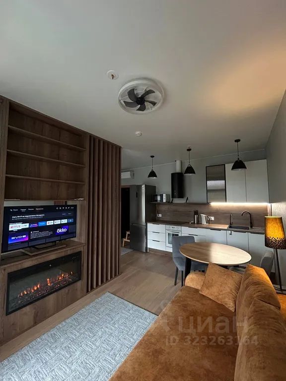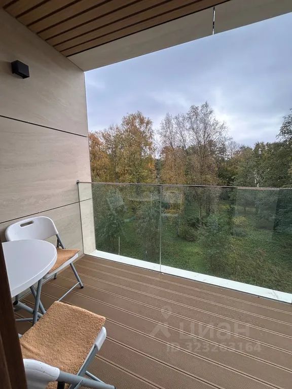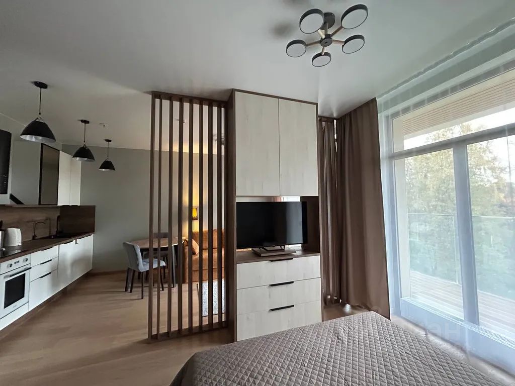 Уютная студия с камином и большой лоджией с видом на залив и зелень.