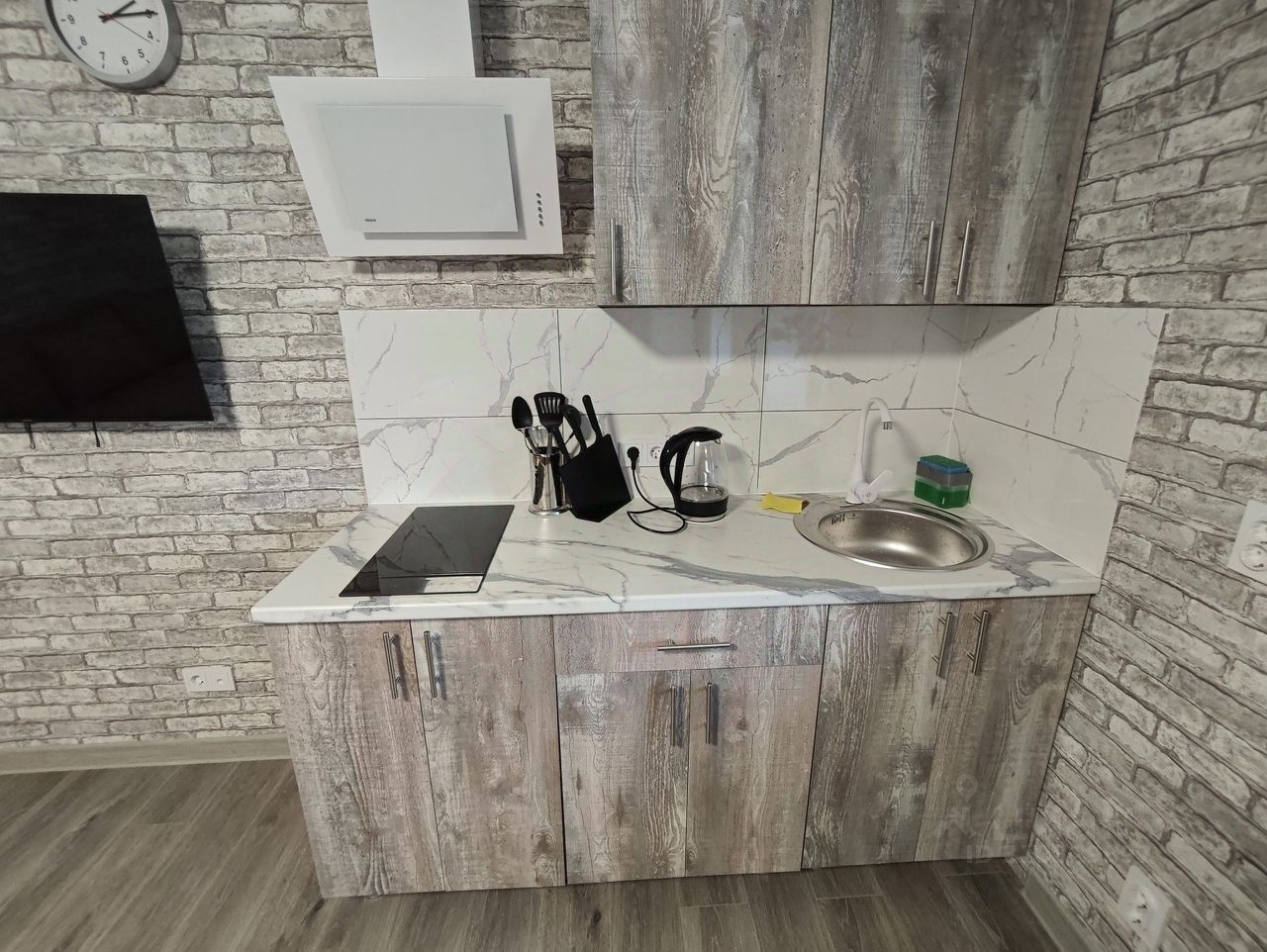 - кухонная зона с электрической варочной поверхностью, чайником, вместительным холодильником с морозильной камерой,