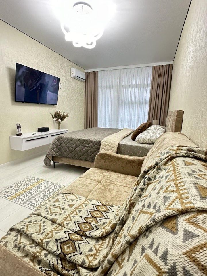 В наличии вся необходимая для комфортного проживания, мебель и современная бытовая техника: двуспальная кровать, сплит-система, ЖК-телевизор с выходом в Ютуб, утюг, фен, гладильная доска, чайник, холодильник, газовая плита.