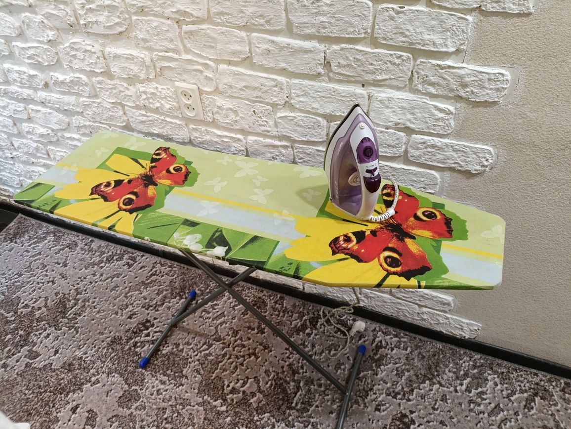 - Лоджия: остеклена, с утепленным полом. - А также: есть гладильная доска с утюгом, пылесос и оборудование для уборки.