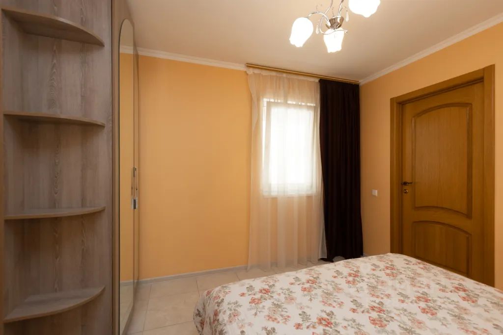 На 1м этаже апартаментов - спальня, кухня-гостиная, туалет и широкий видовой балкон со стульями и столиком. На 2м этаже - 3 спальни и 2 санузла. В каждой спальне широкая двуспальная кровать, диван в гостиной можно разложить и использовать в качестве дополнительного спального места.