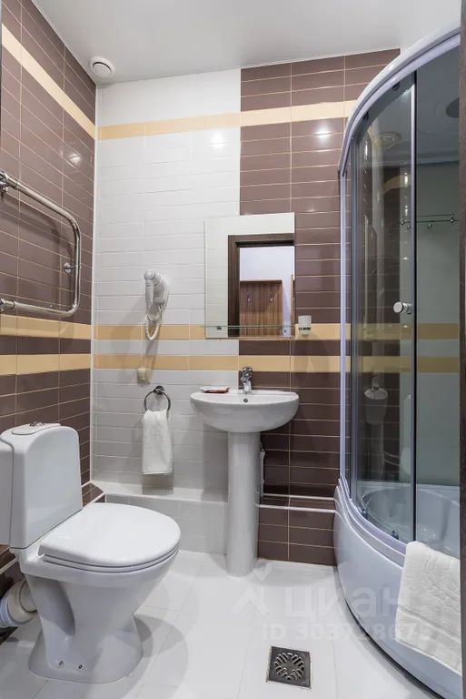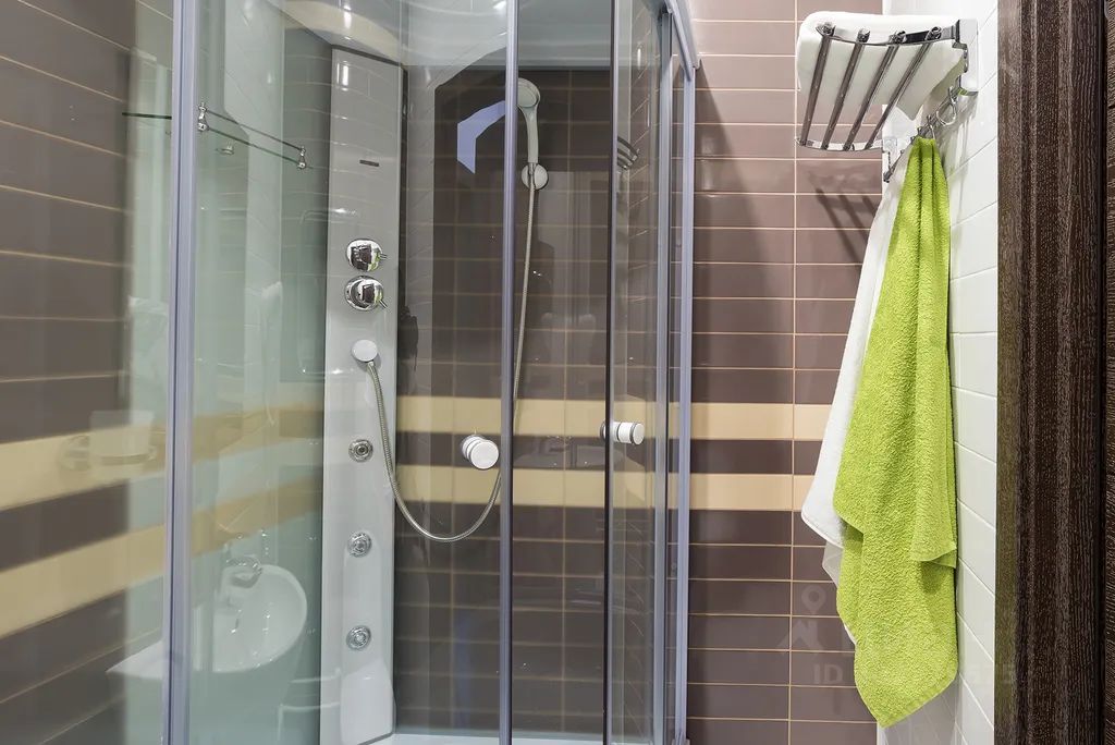 - Ванная комната с душевой кабиной и феном, косметические принадлежности, тапочки,