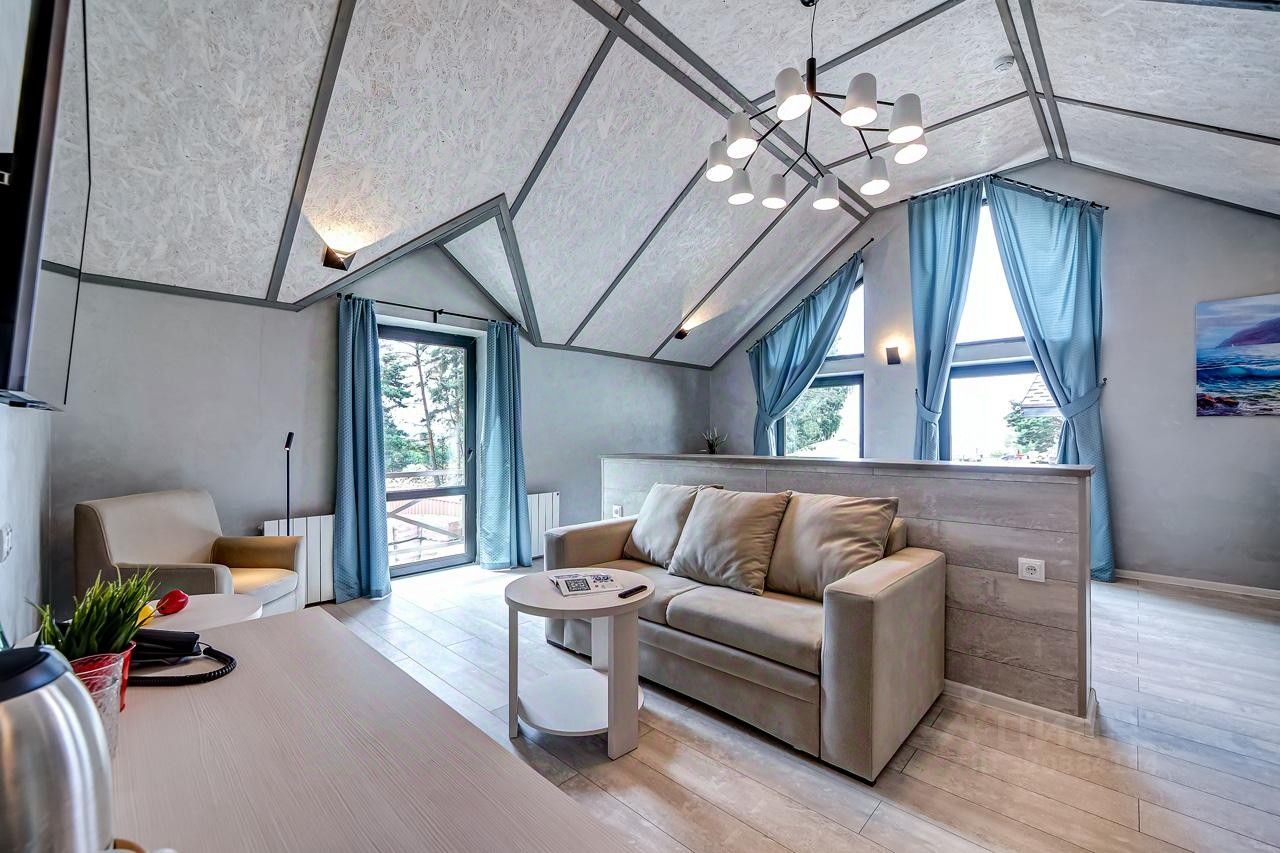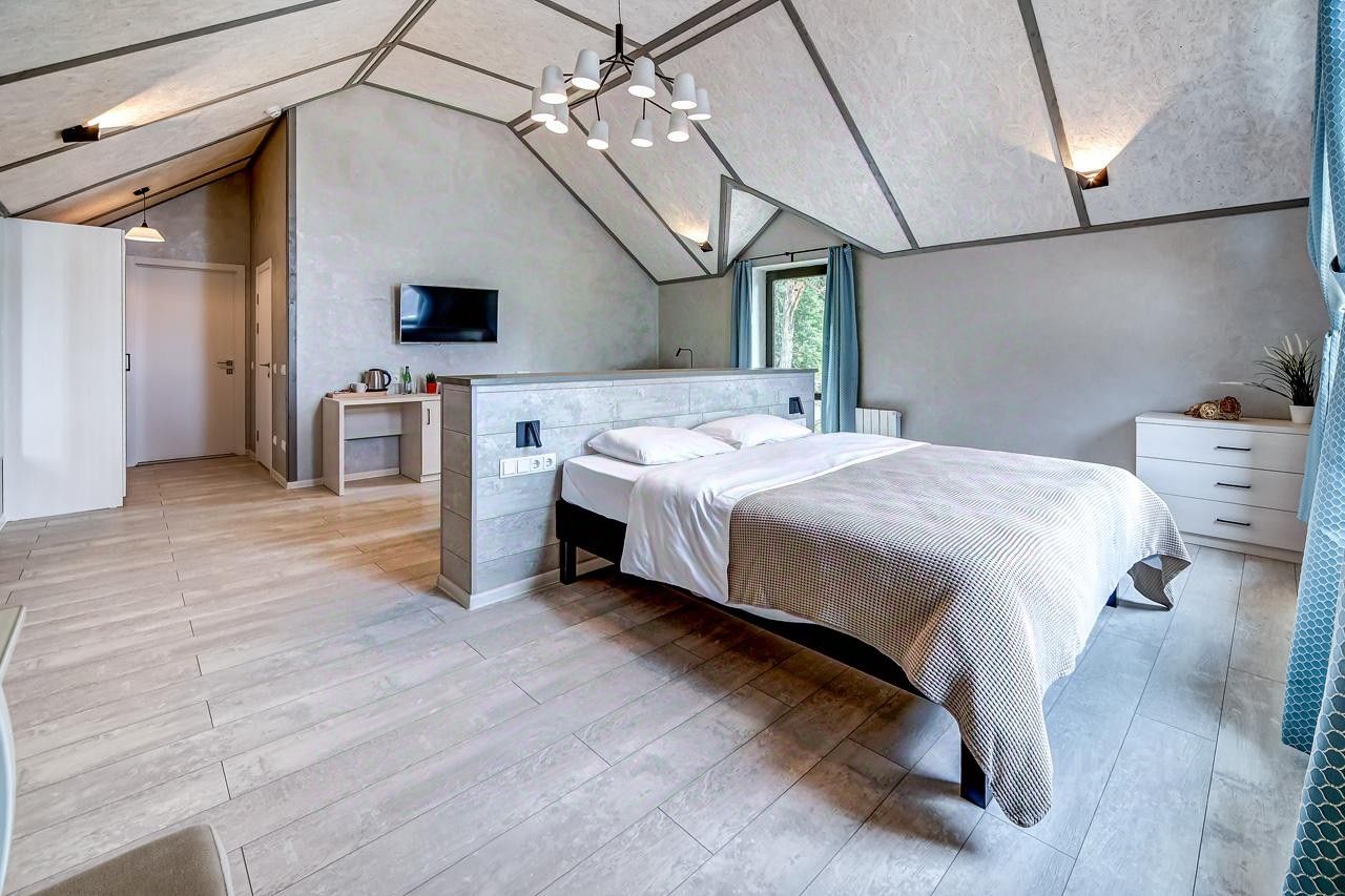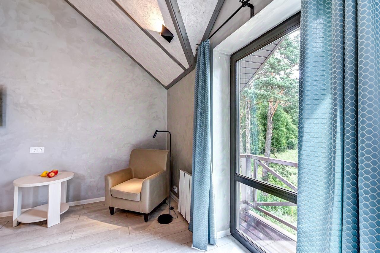 Просторный номер джуниор сьют в дизайне скандинавской классики, с прекрасным видом на территорию базы отдыха и залив.