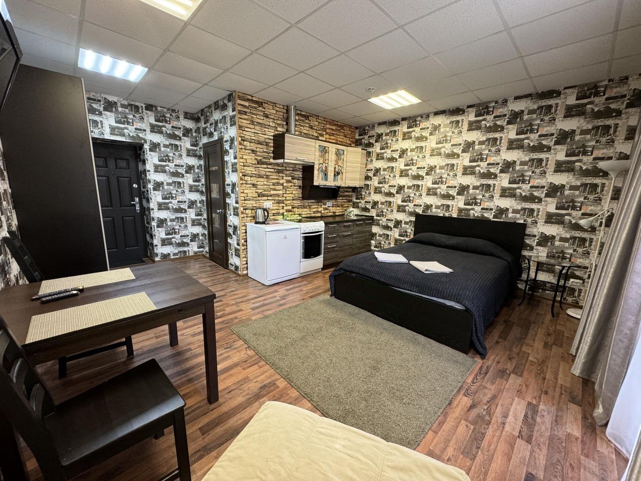 В номере двуспальная кровать и раскладной диван. Возможна установка детской кроватки.