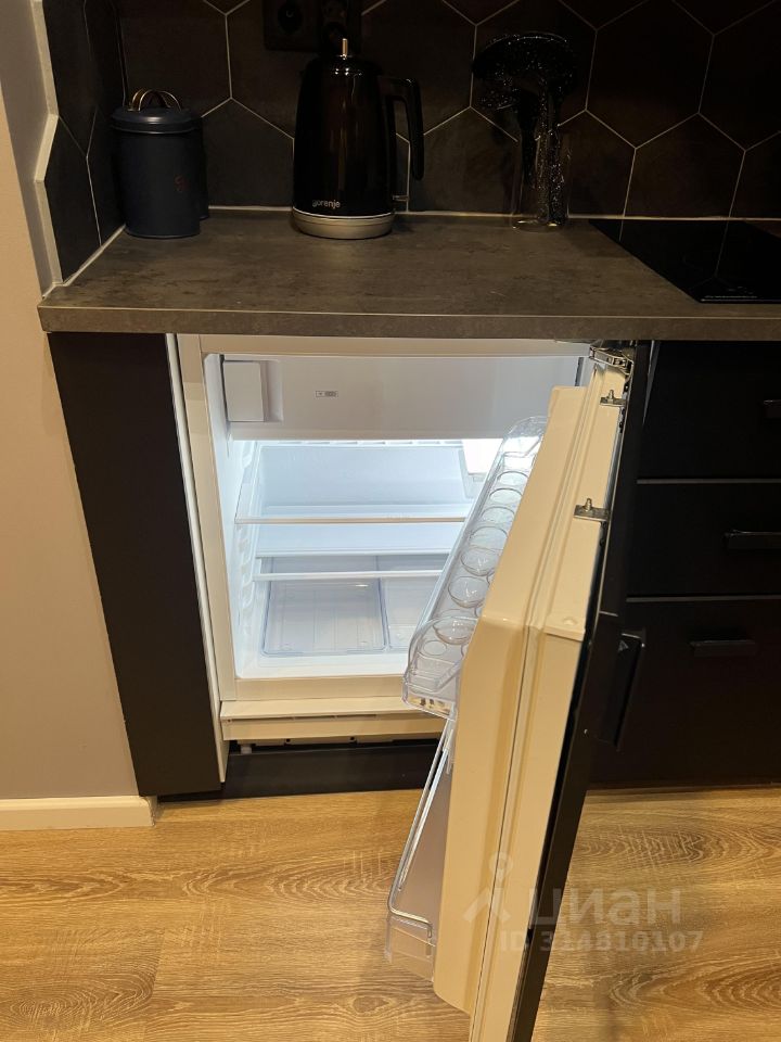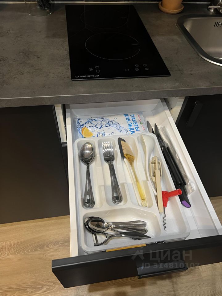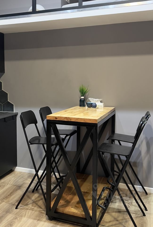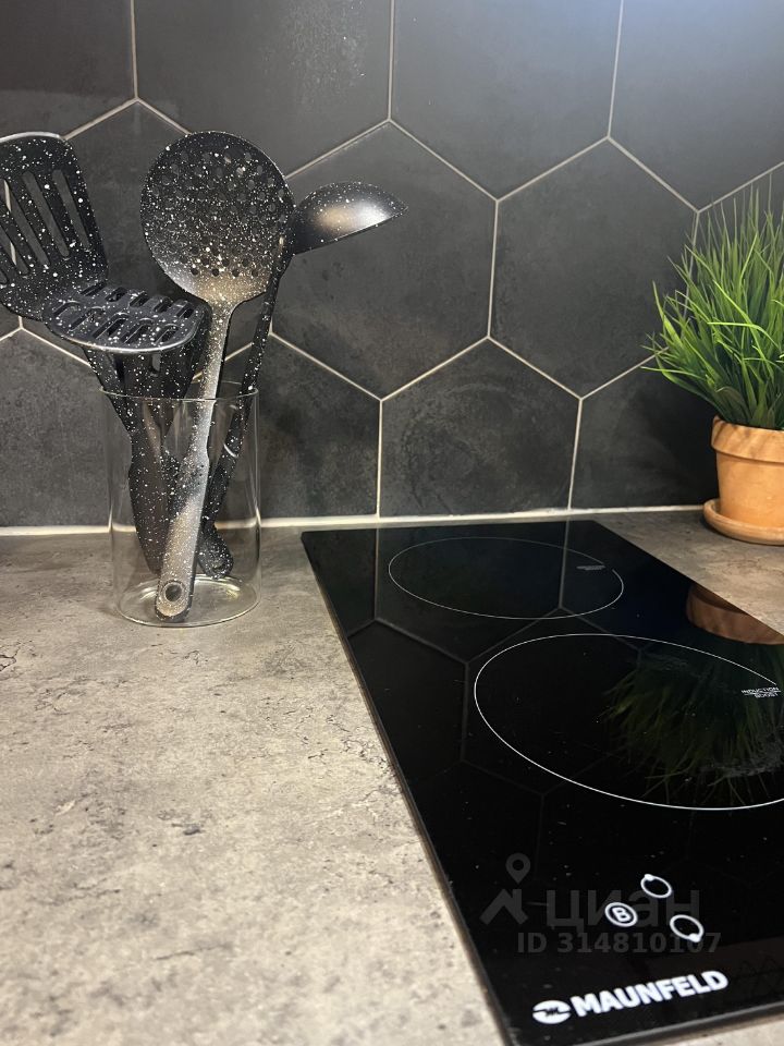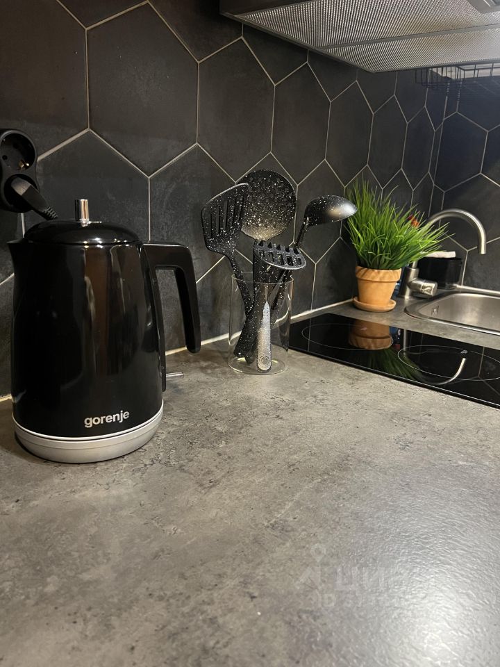 Полностью укомплектованная кухня (чайник, холодильник, столовые предметы, микроволновая печь, духовой шкаф, встроенная индукционная плитка, вытяжка, барный стол и стулья.