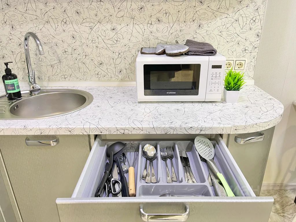 Кухня с плитой, микроволновкой, чайником и всей необходимой посудой.