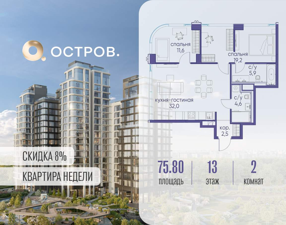 Продаётся 2-комн. квартира от застройщика: общая площадь 75.80 м, жилая 30.80 м, кухня 32.00 м, 13-й этаж, жилой квартал «Остров 12», корпус 1 (секция 3) . Срок сдачи: 1 квартал 2029 года.