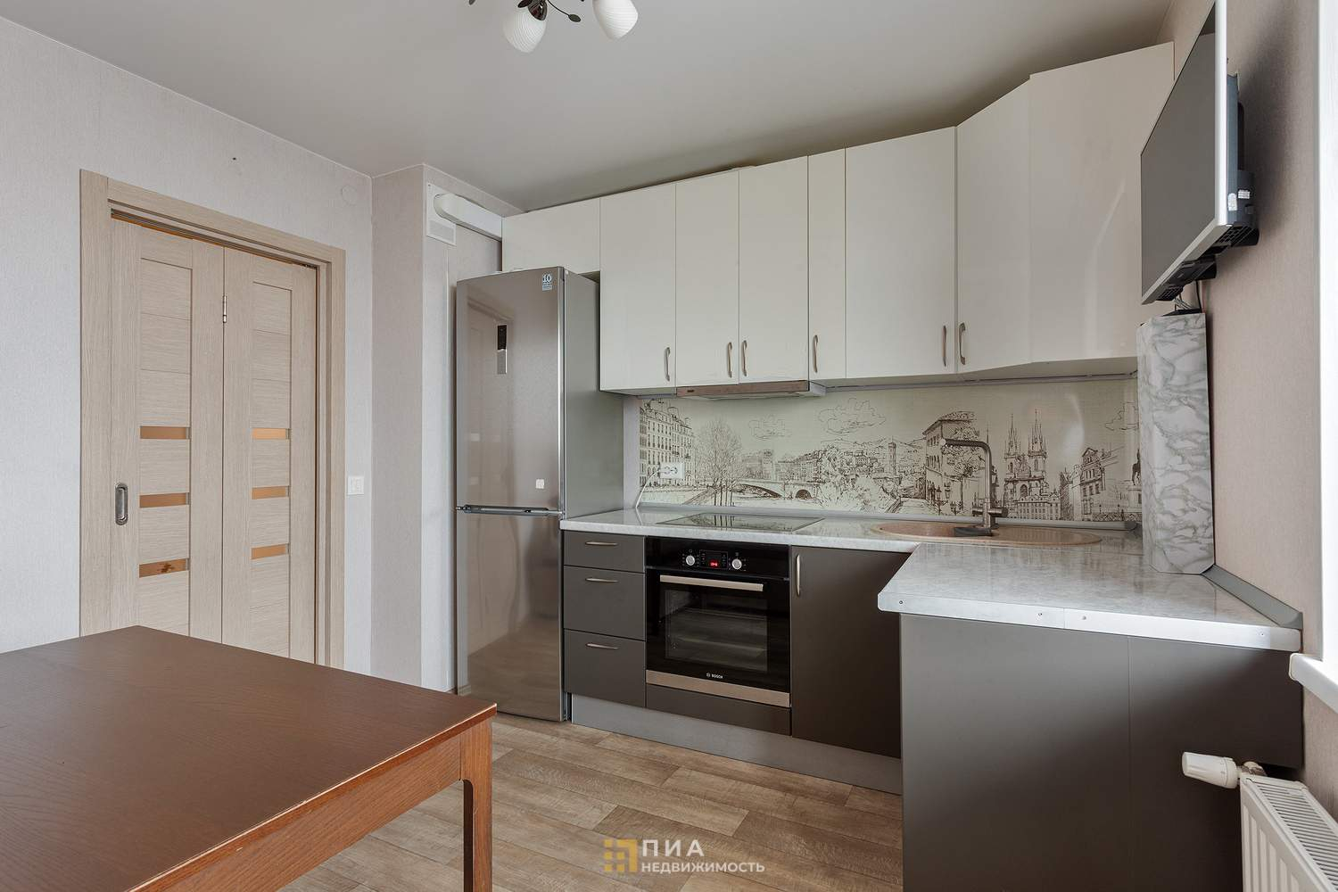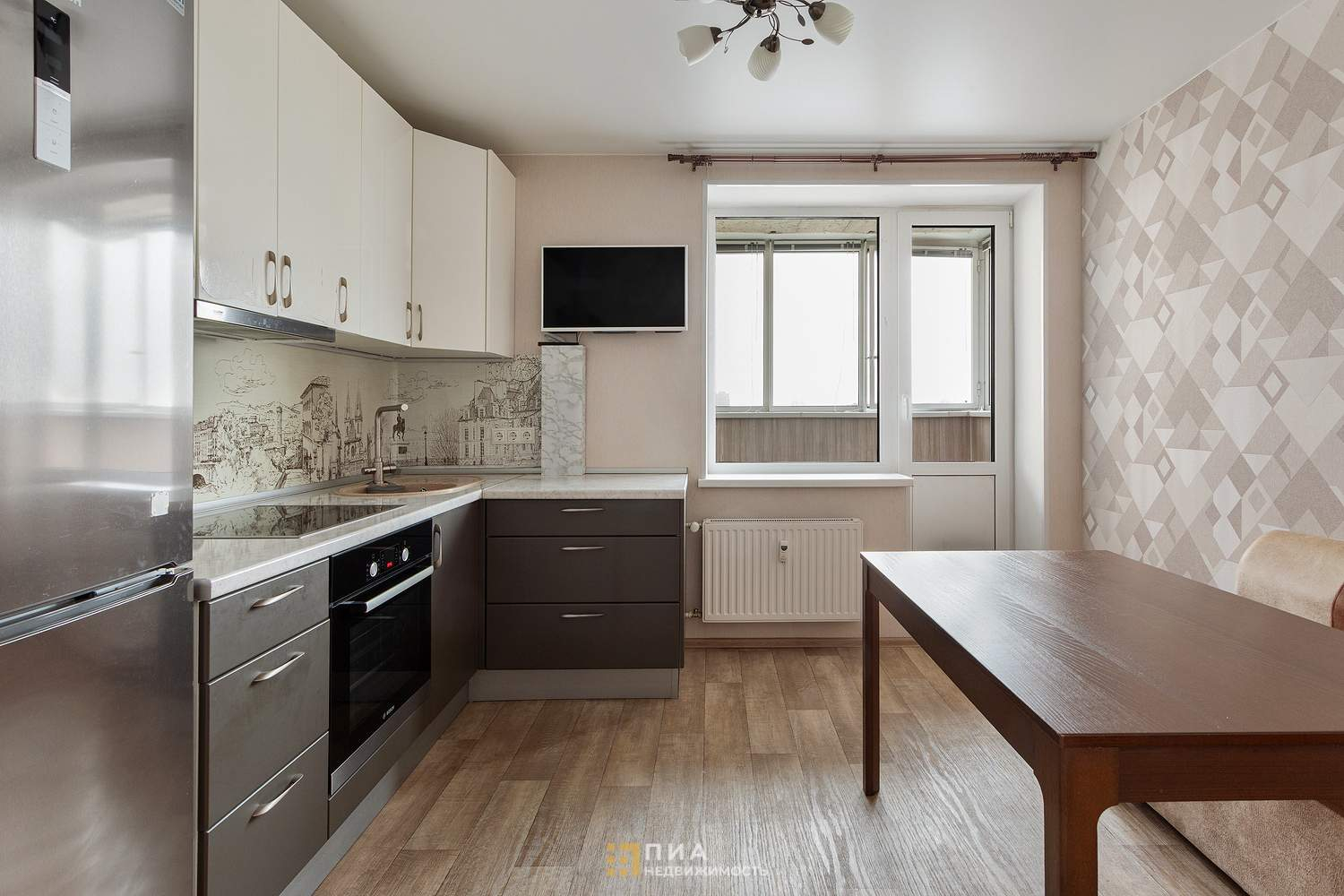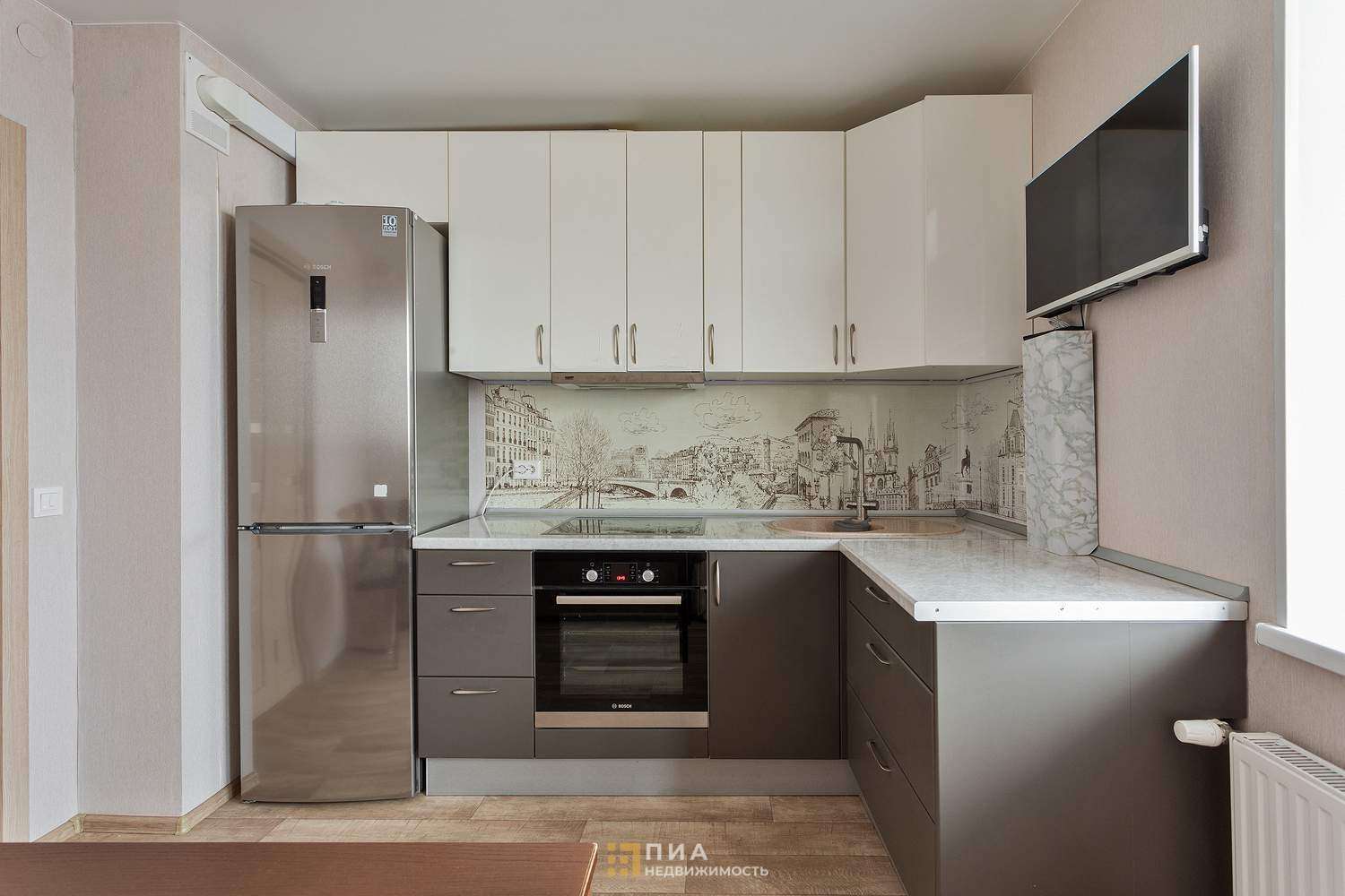 Установлен кухонный гарнитур со встроенной техникой, остается новым хозяевам.