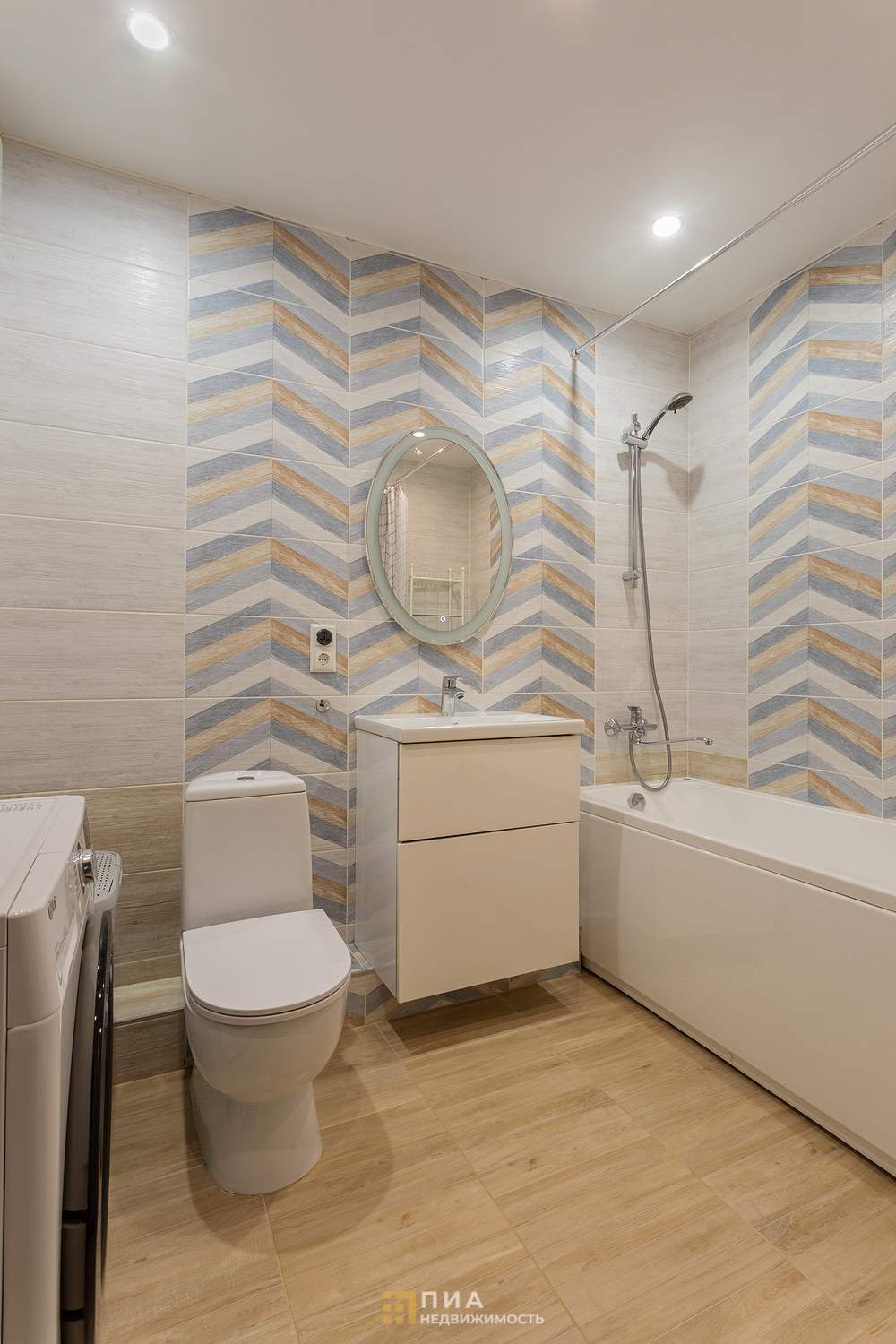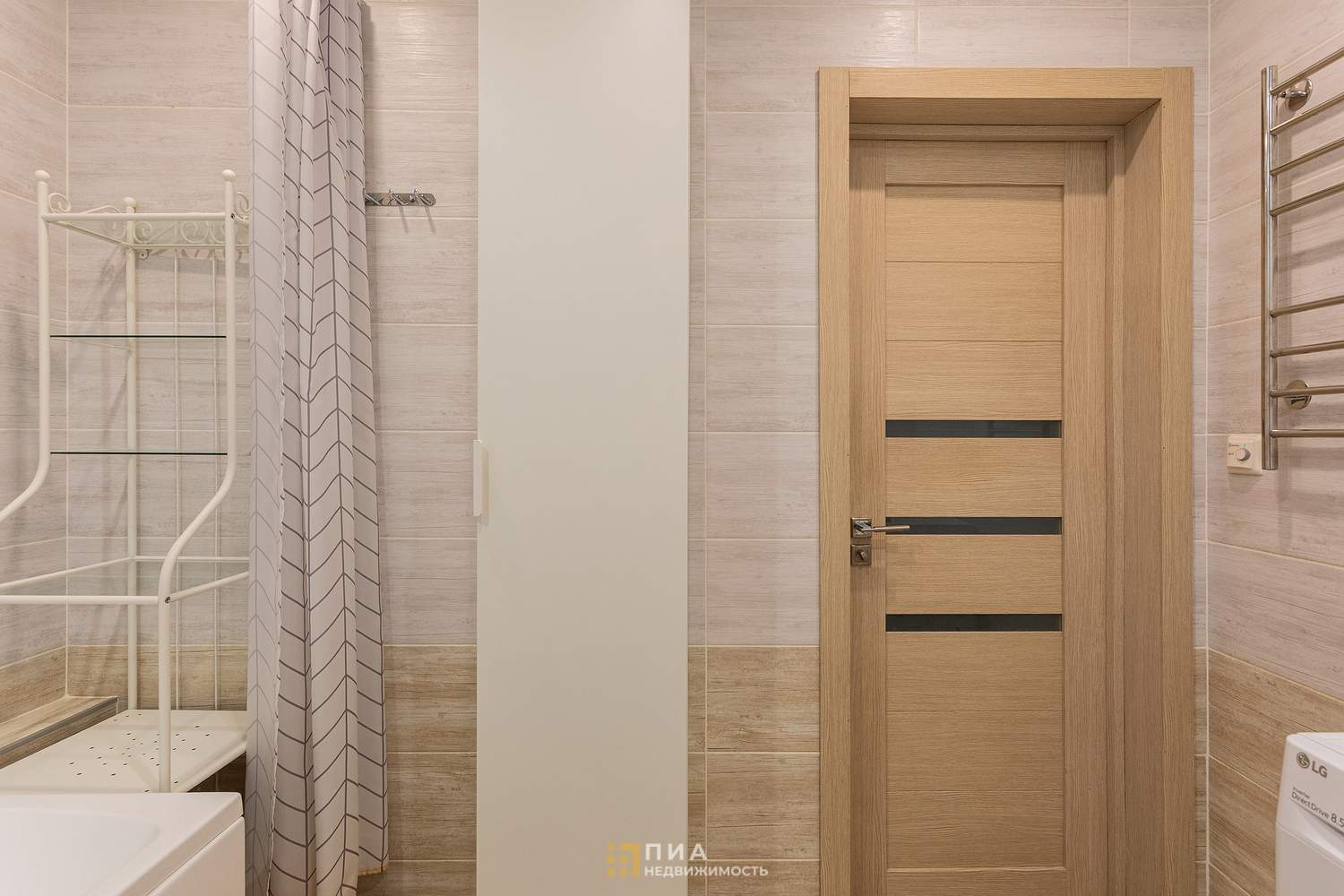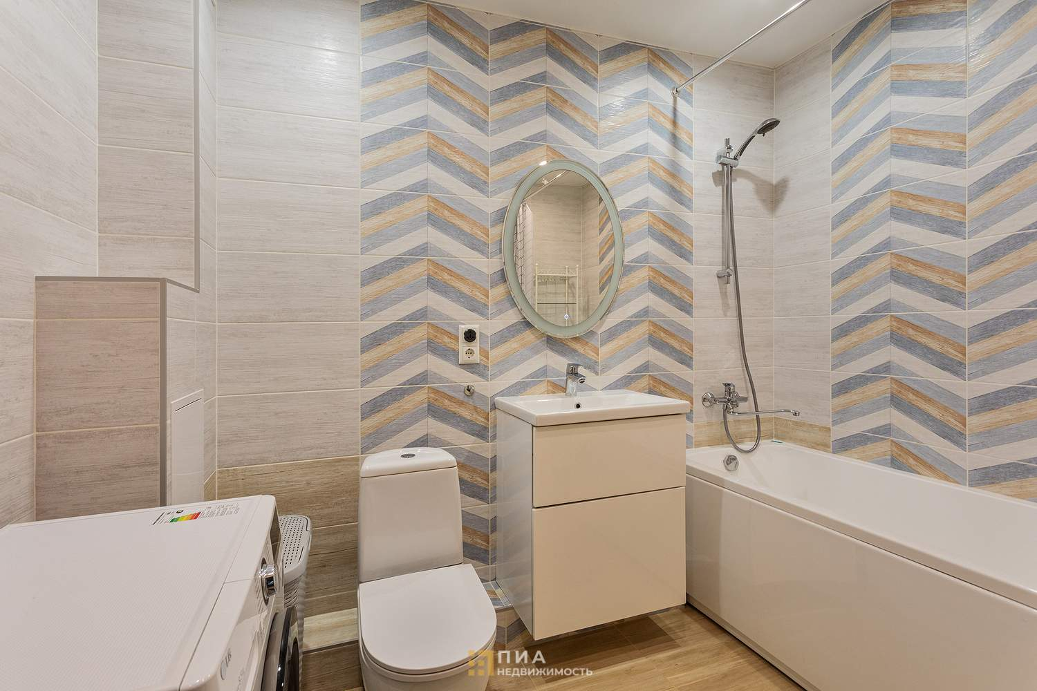 Современный санузел в кафеле, аккуратный и чистый.