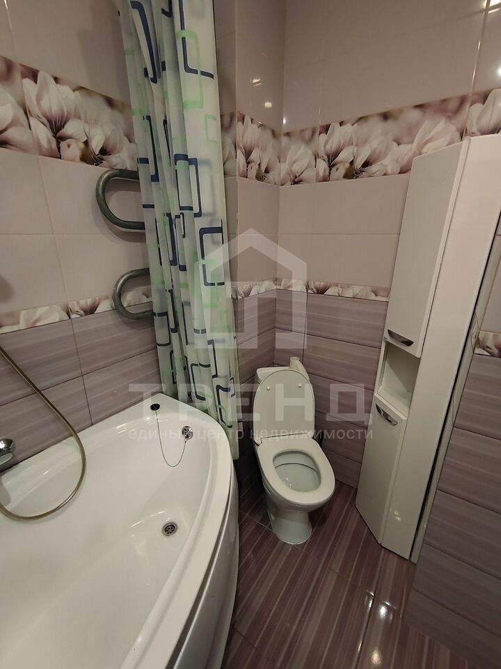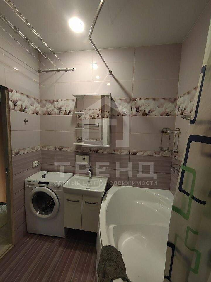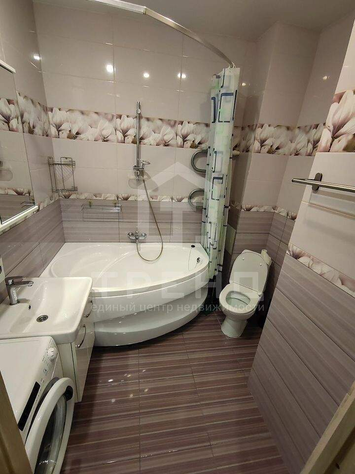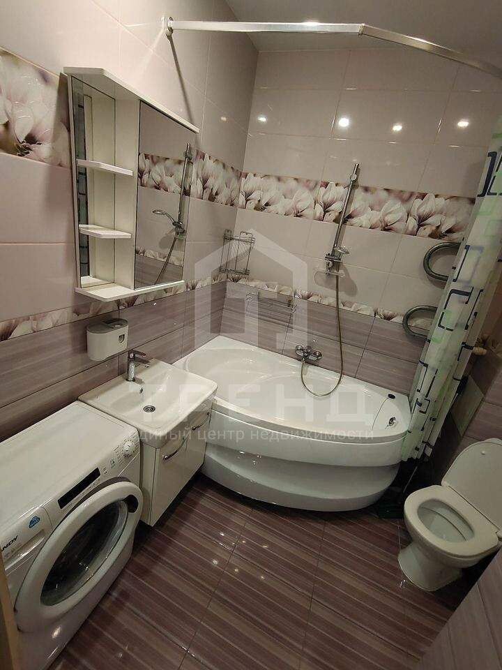 Большой совмещённый санузел отделан свежей плиткой и оборудован ванной. Не приходится жертвовать удобством в угоду метража, здесь просторно и функционально.
