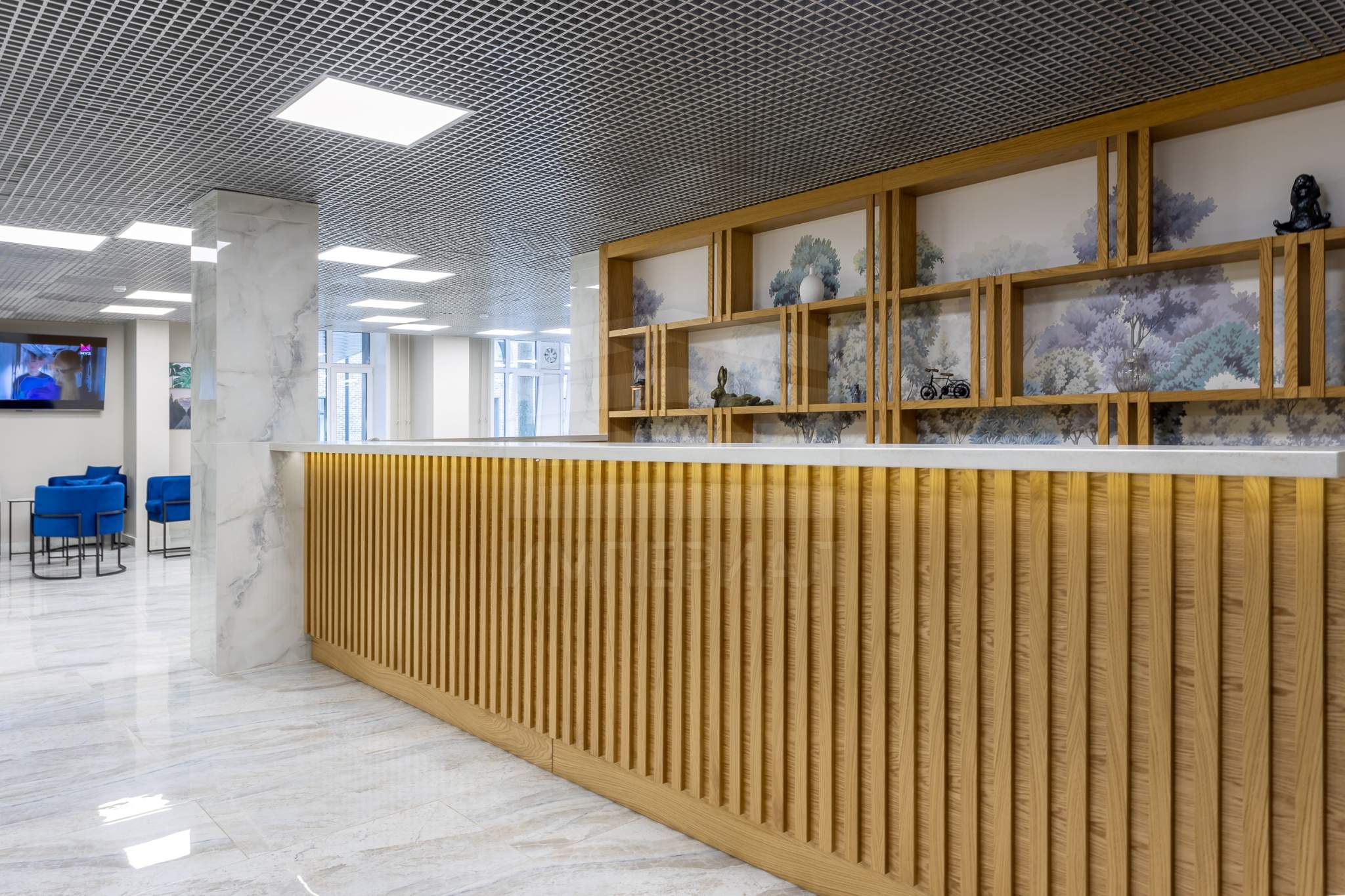 При входе резиденты и их гости попадают в стильное лобби с ресепшеном, а также лаундж-зону. Стильный интерьер в светлых тонах создает домашнюю уютную атмосферу и в то же время подчеркивает статус комплекса.