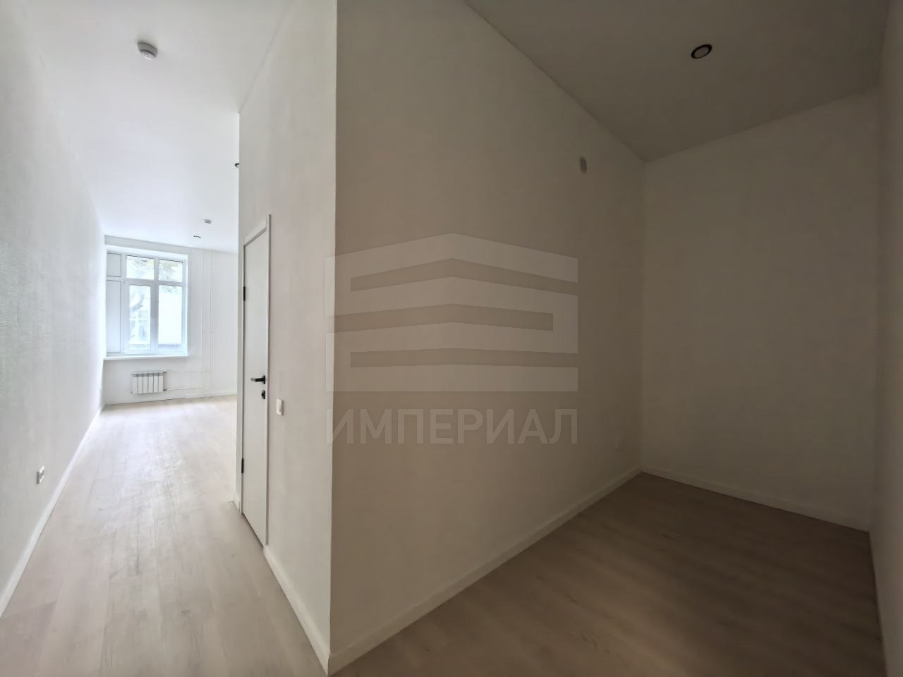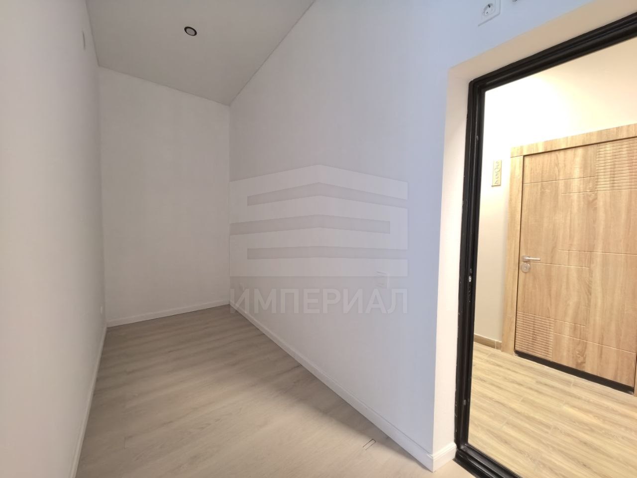 На стенах поклеены обои под покраску, на полу постелен ламинат с плинтусами и откосами. Есть вытяжная вентиляция в санузле и на кухне, выходы хв/гв, место под раковину на кухне. Кроме того, в помещениях уже есть выключатели освещения, розетки для бытовой техники и роутера, а также сделаны закладные для оптоволокна для интернета.