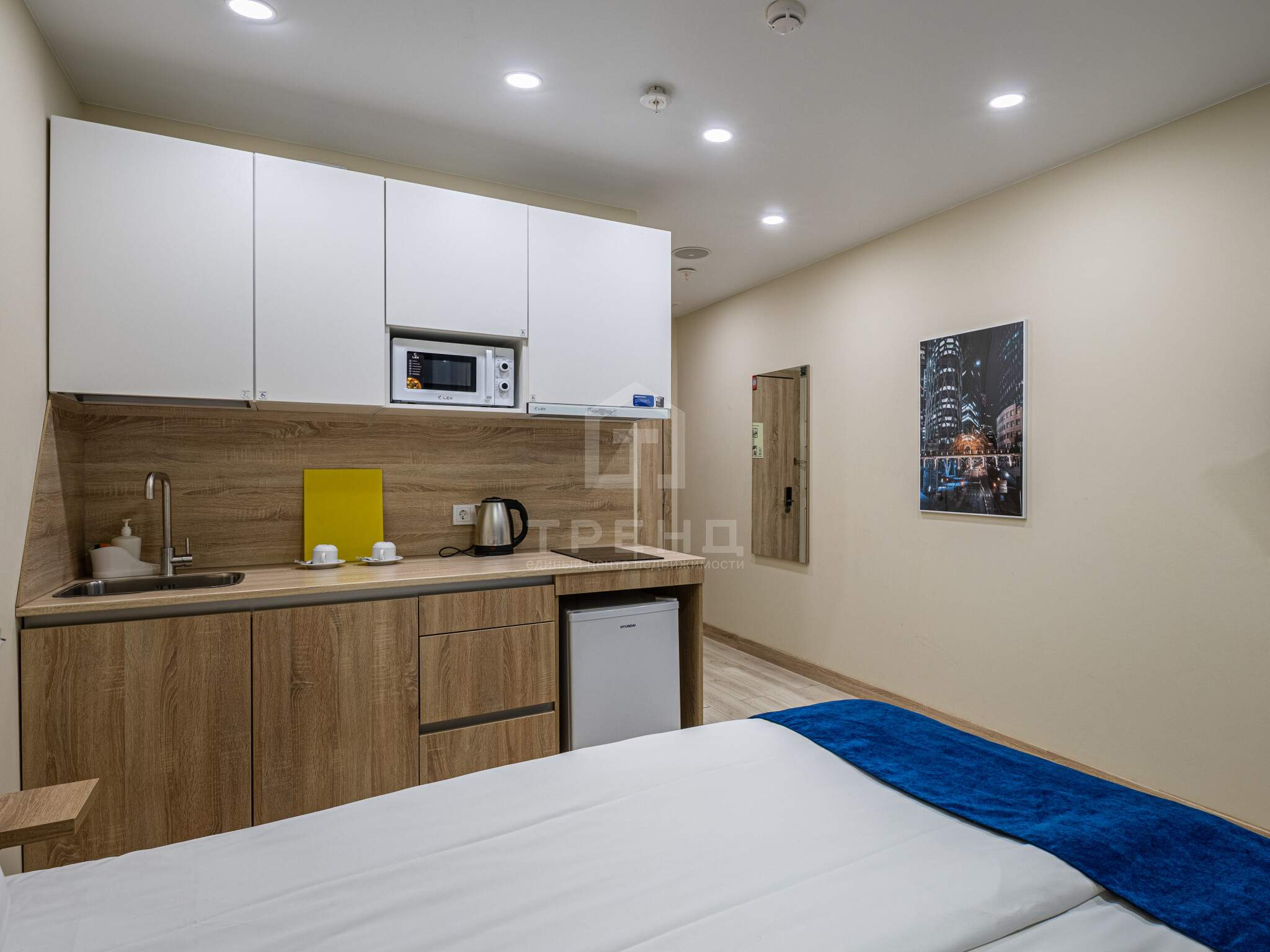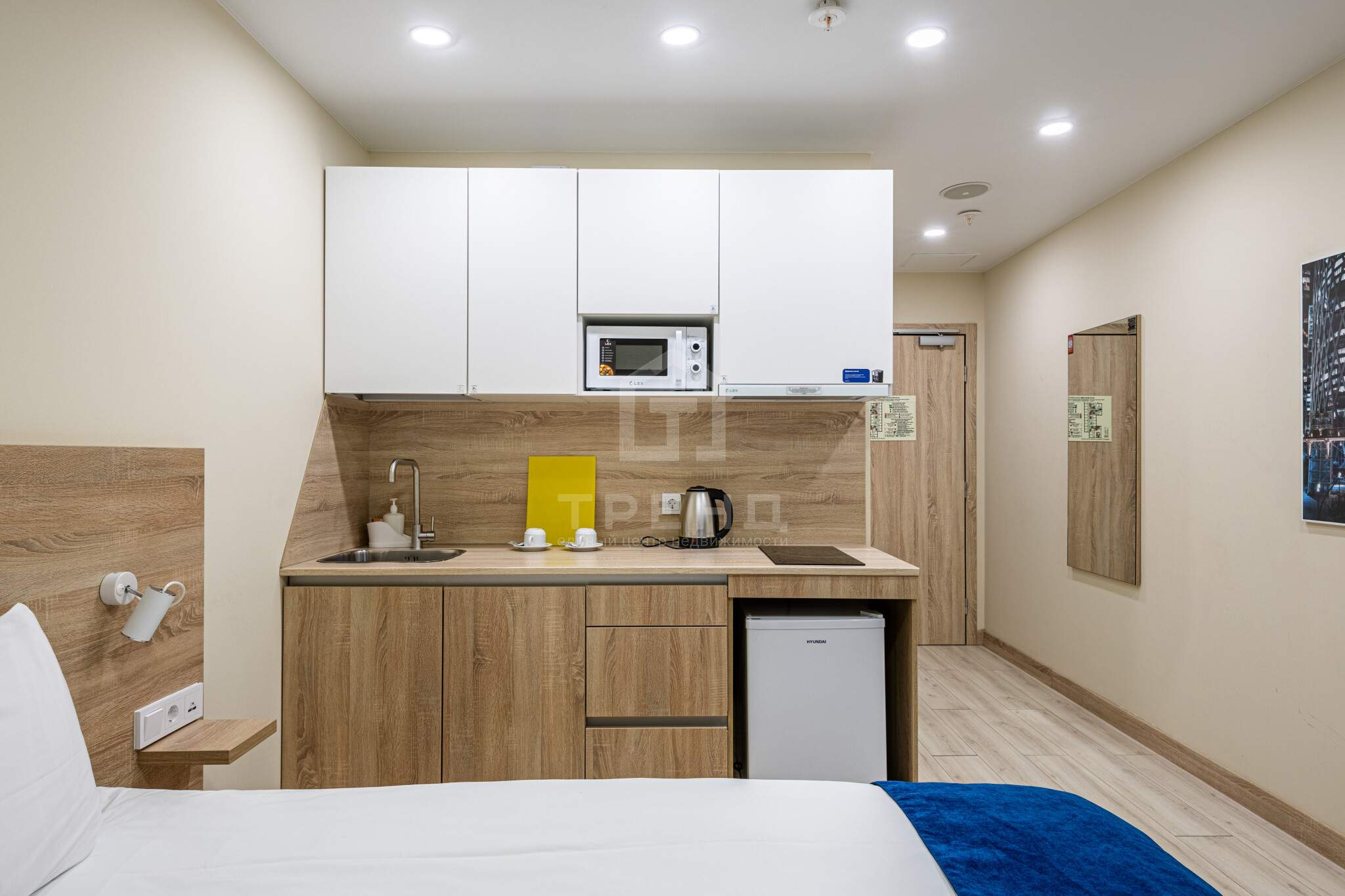 Установлен кухонный гарнитур, электрическая панель, холодильник, микроволновка, чайник, посуда