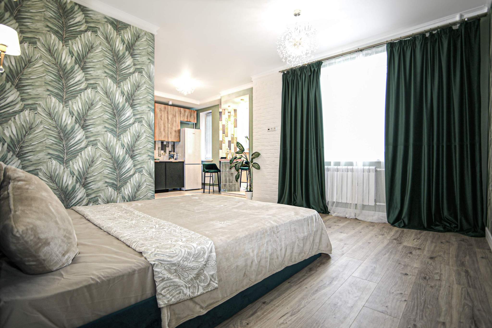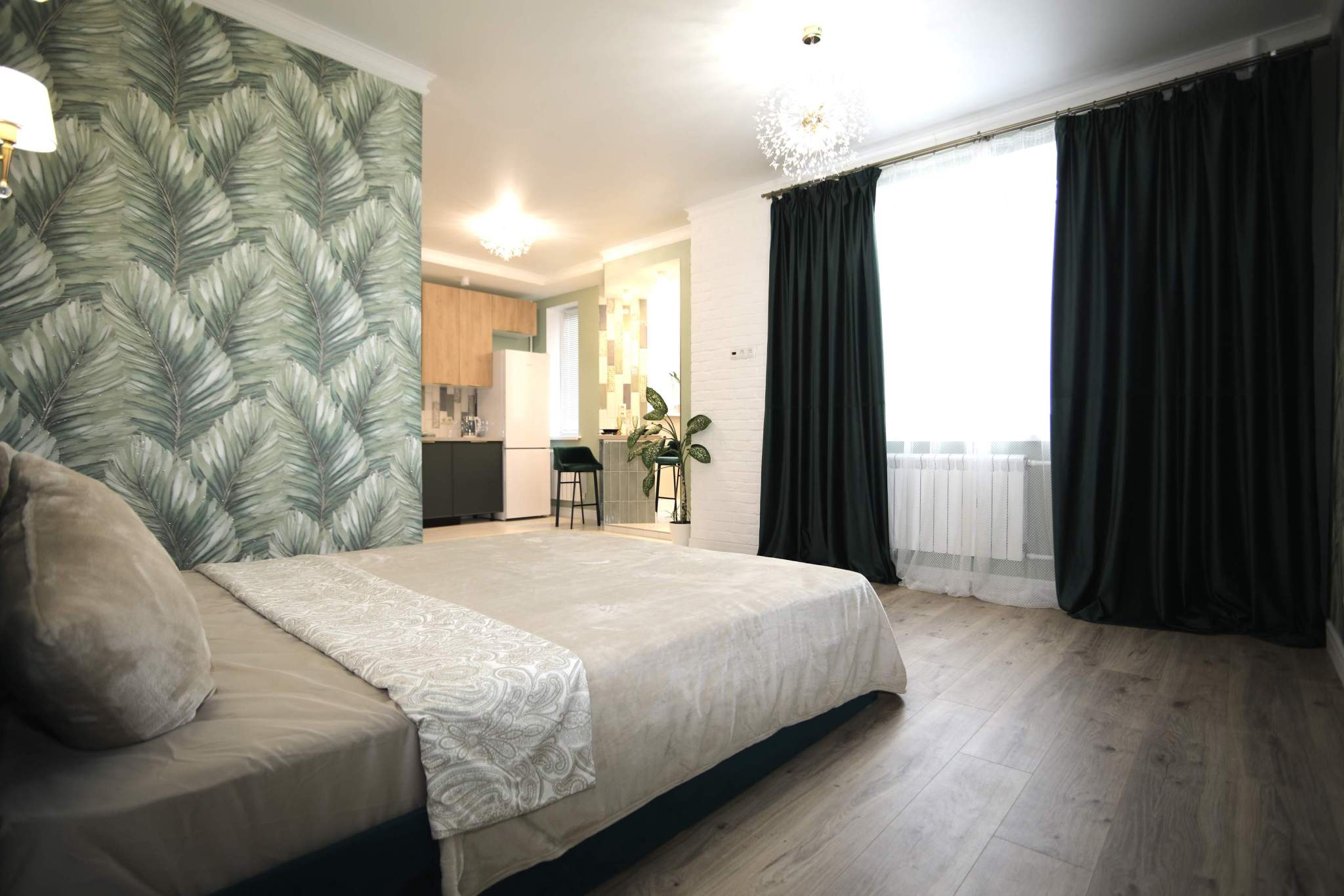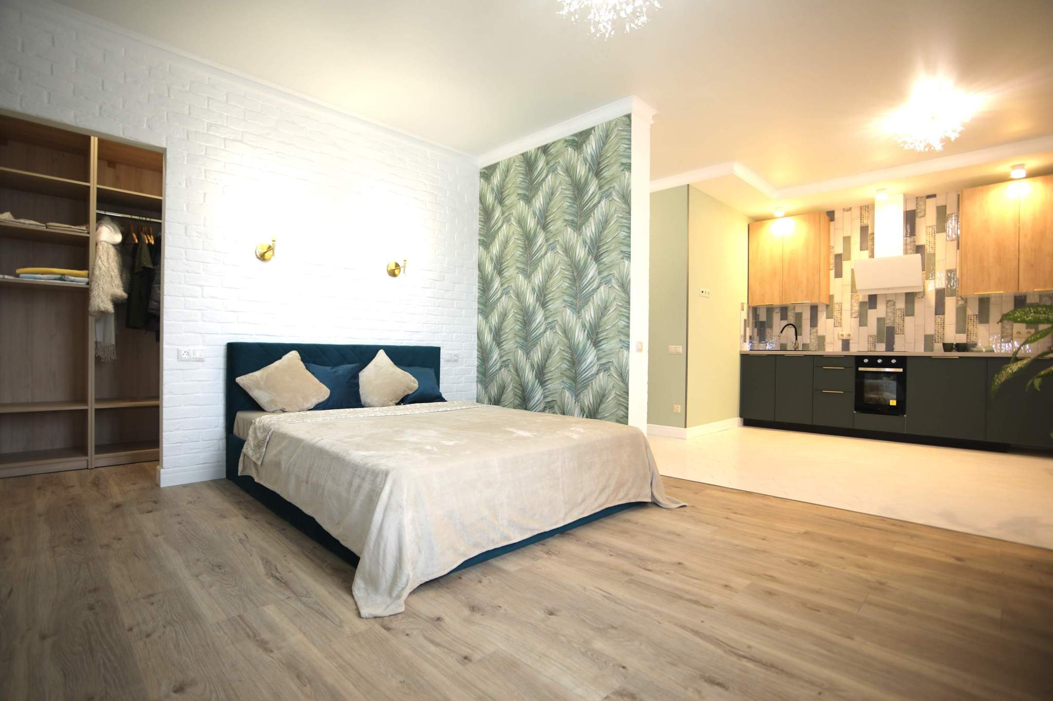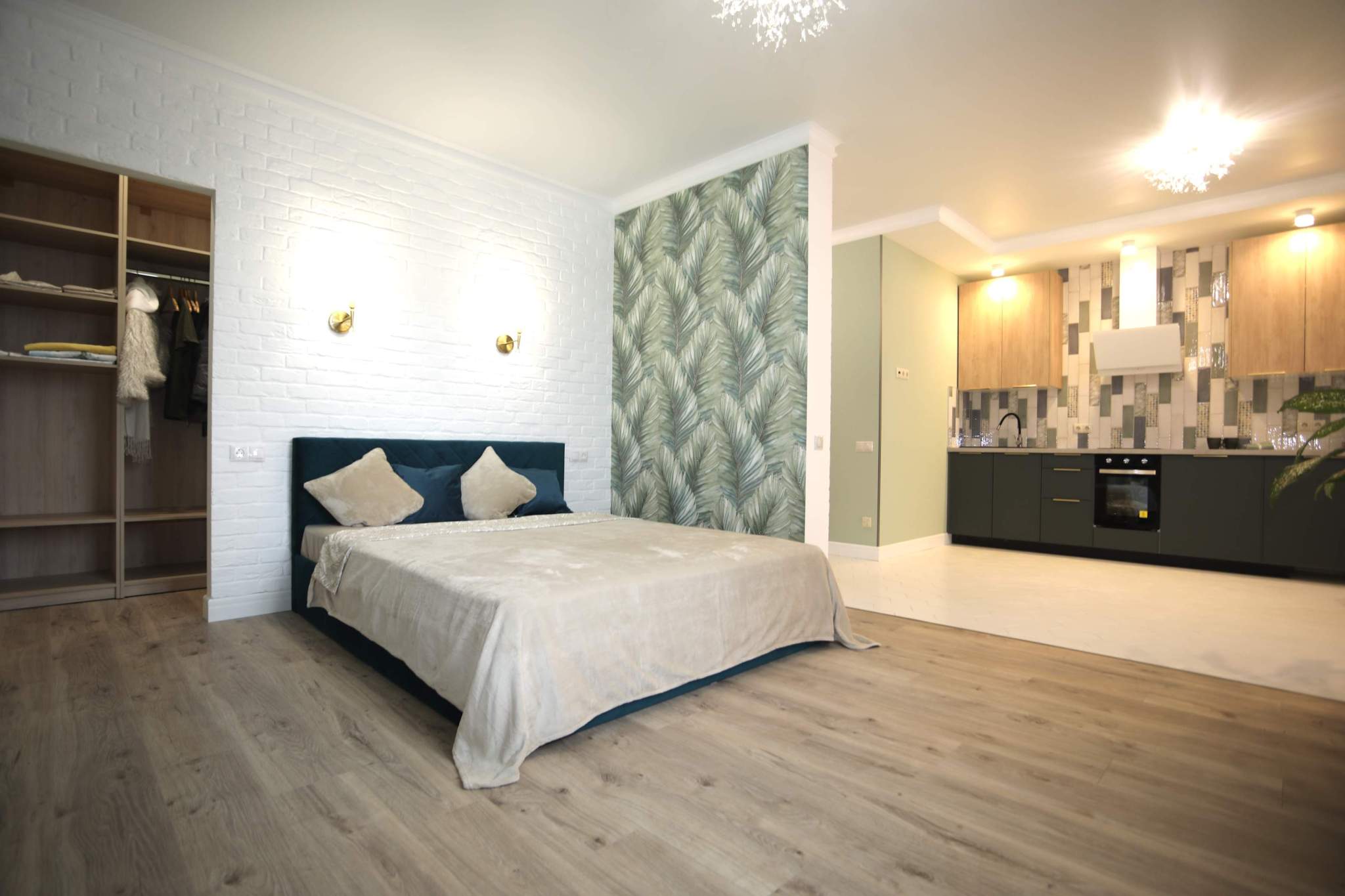 В квартире легко можно установить раздвижную перегородку между комнатой и кухней, изолировав зону сна.
