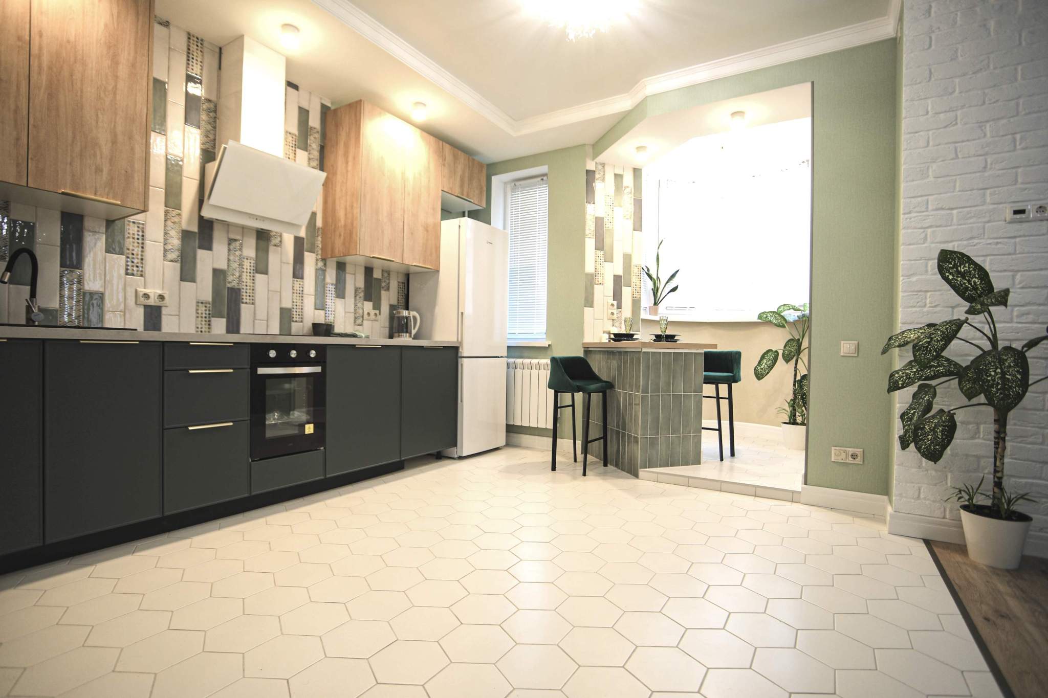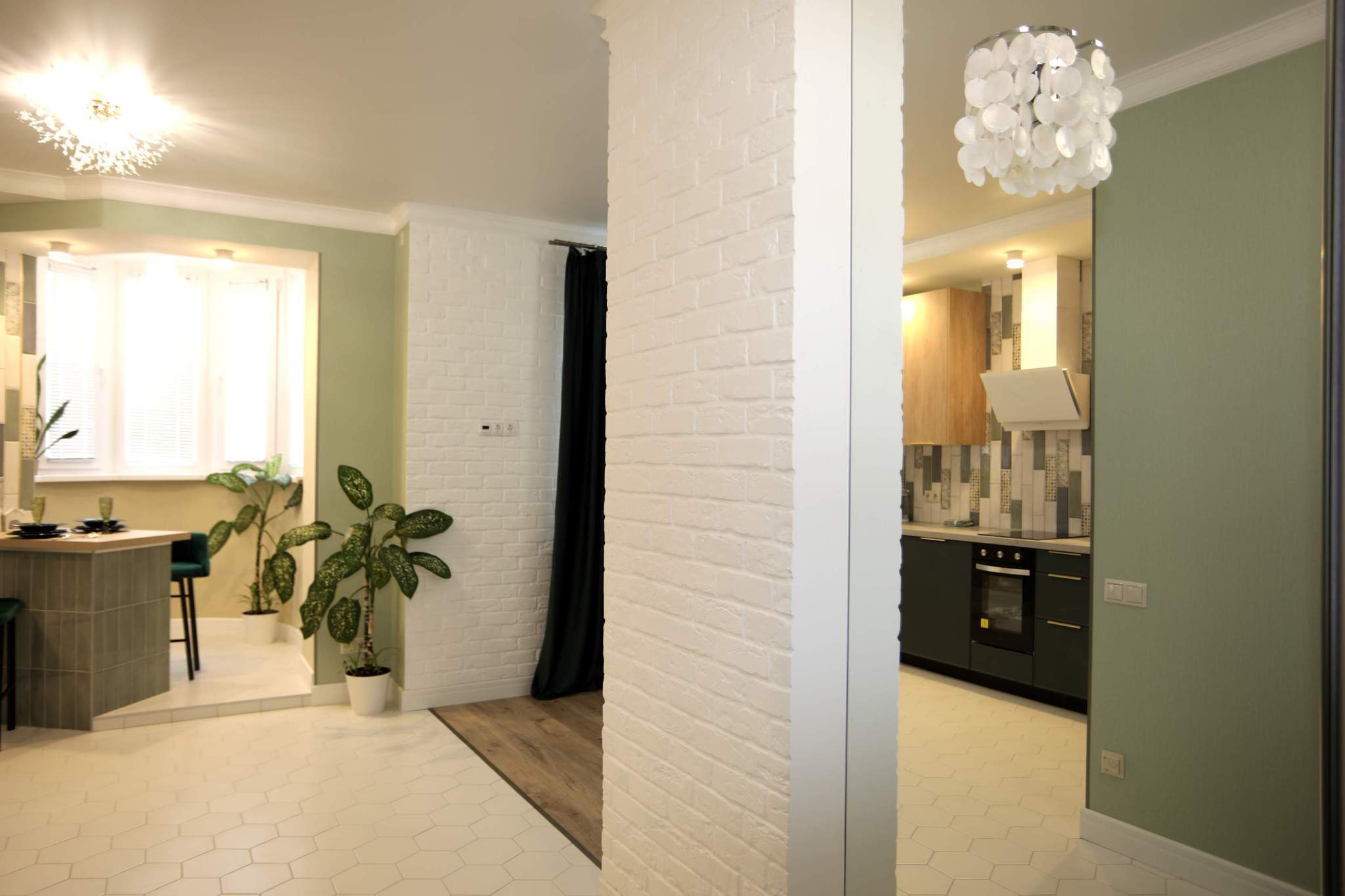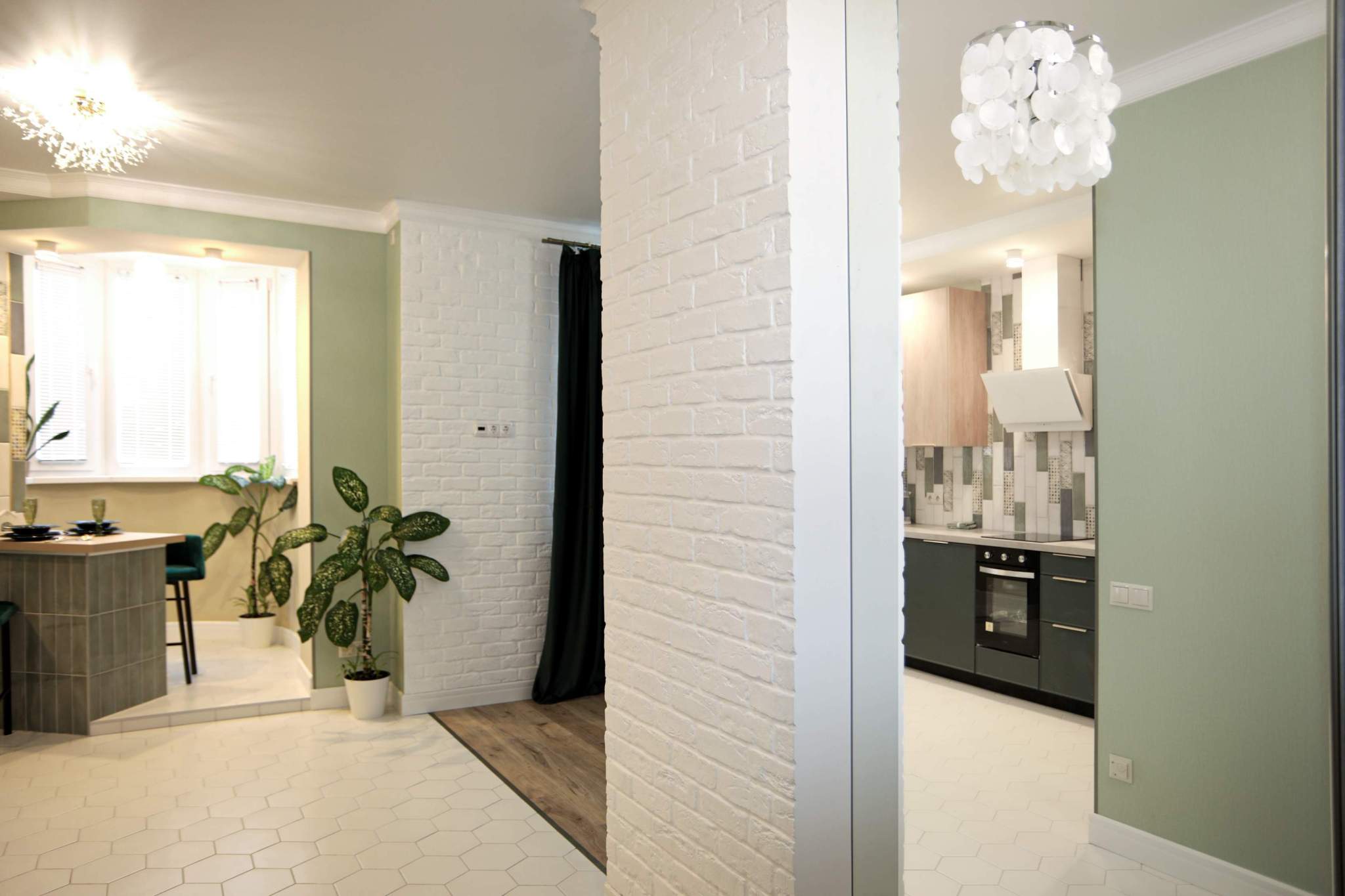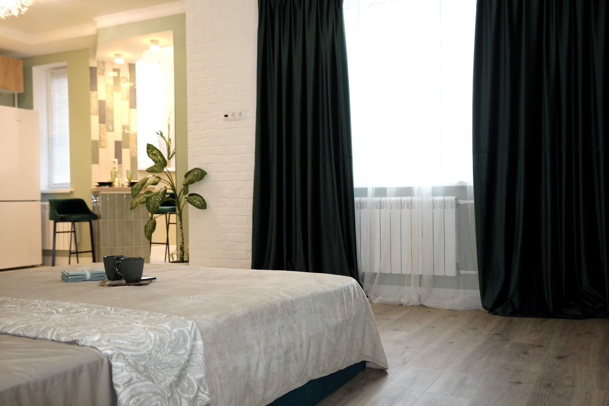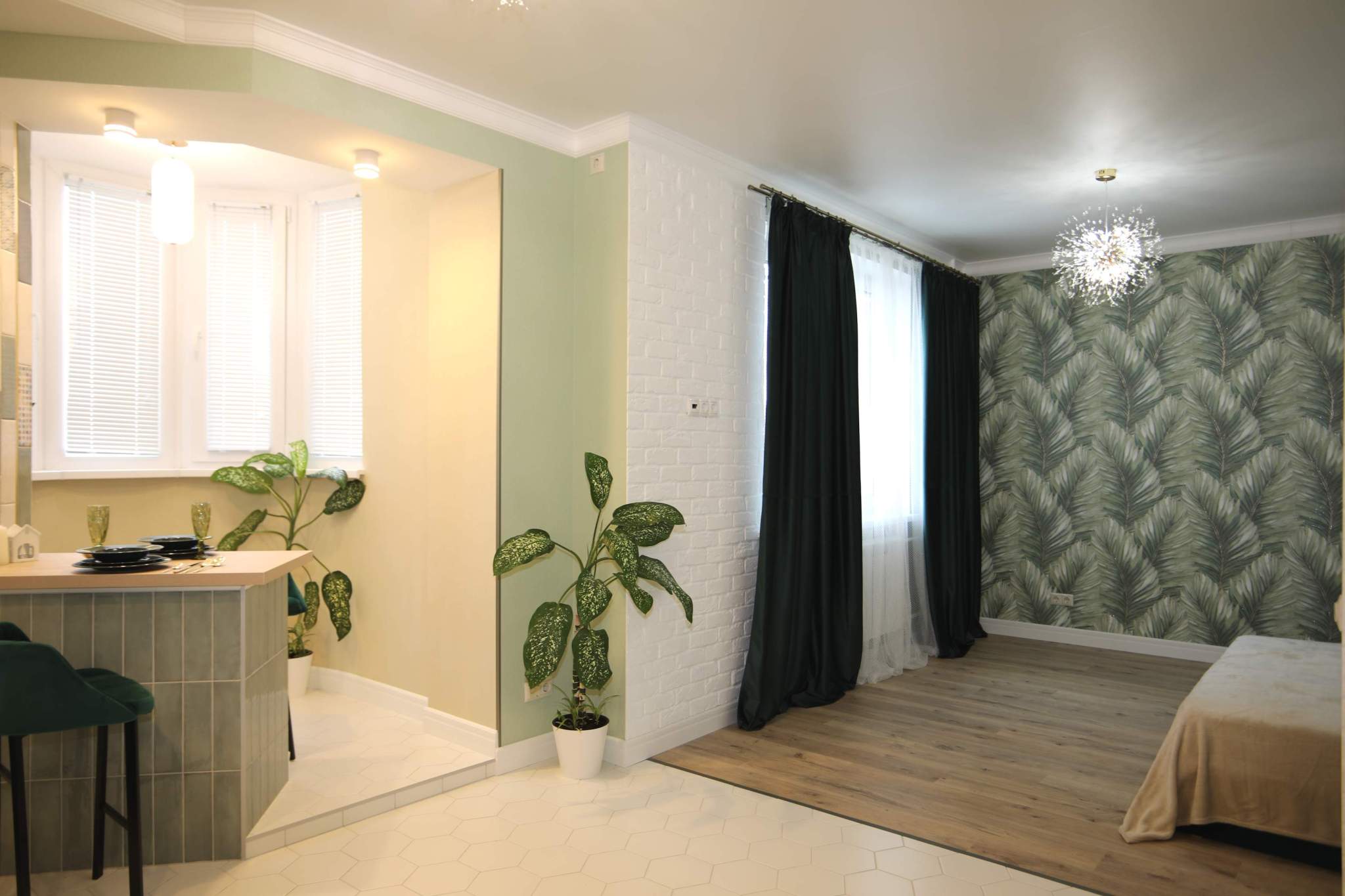 В квартире легко можно установить раздвижную перегородку между комнатой и кухней, изолировав зону сна.