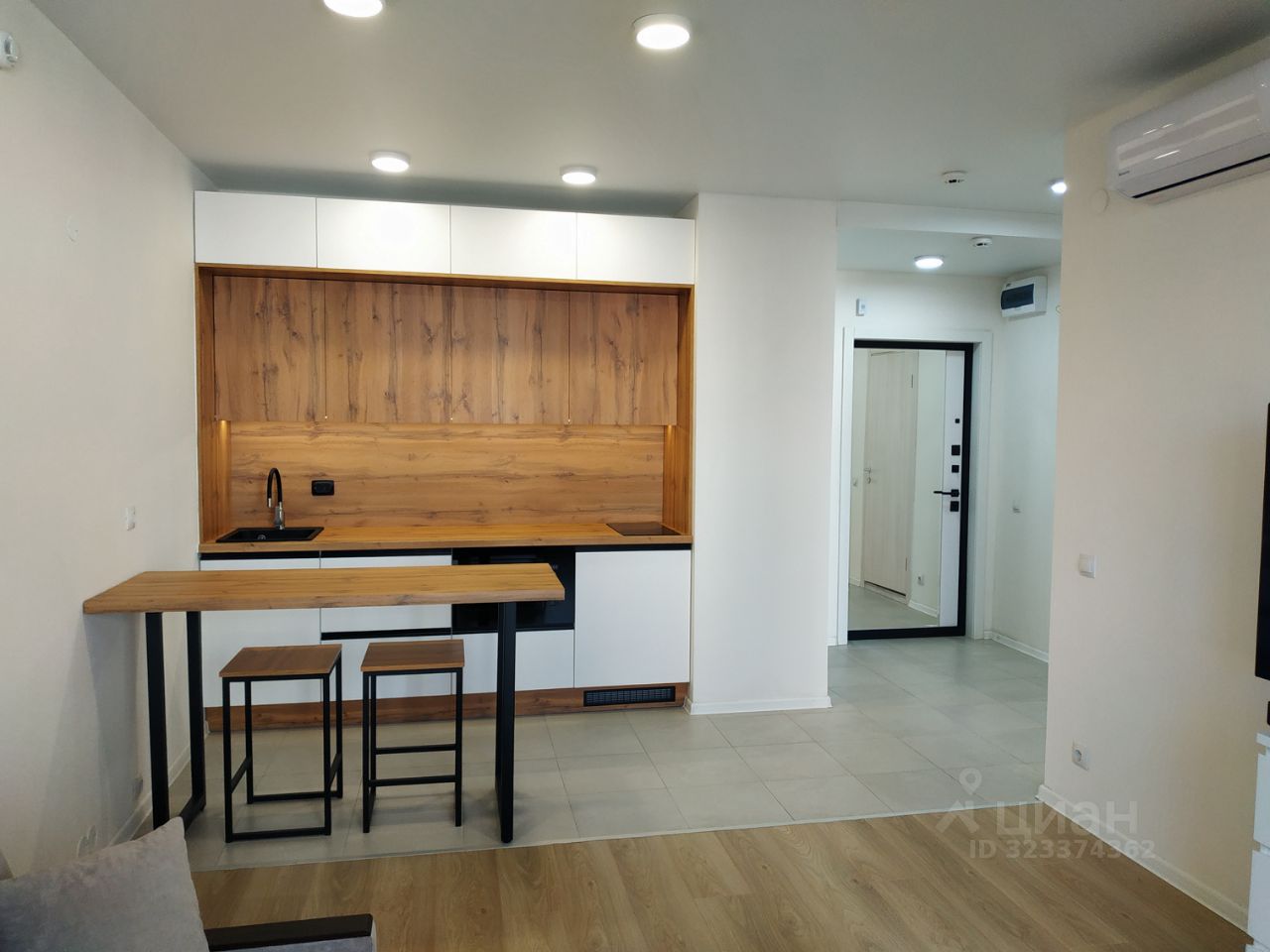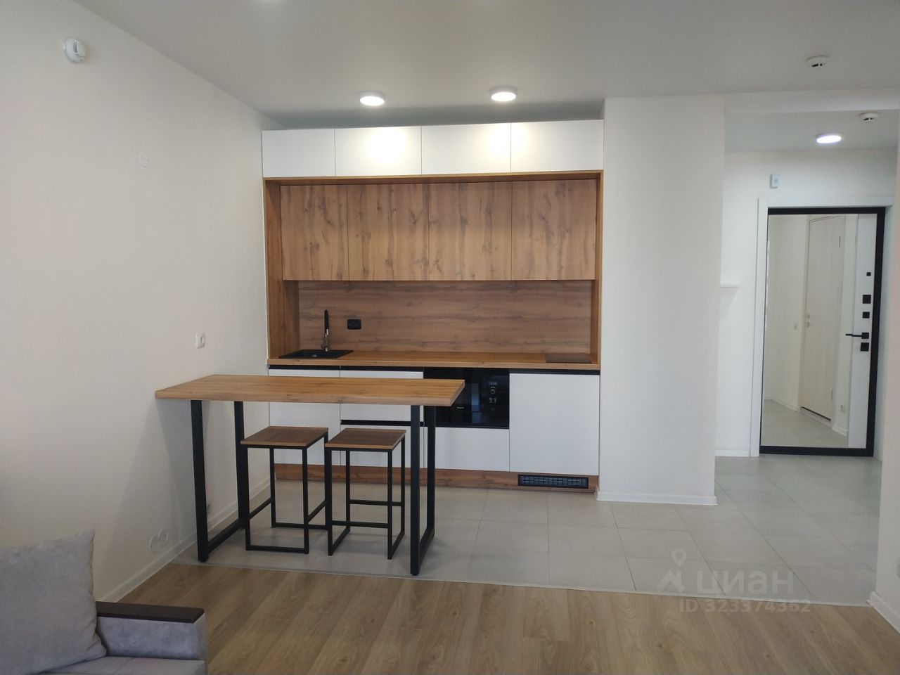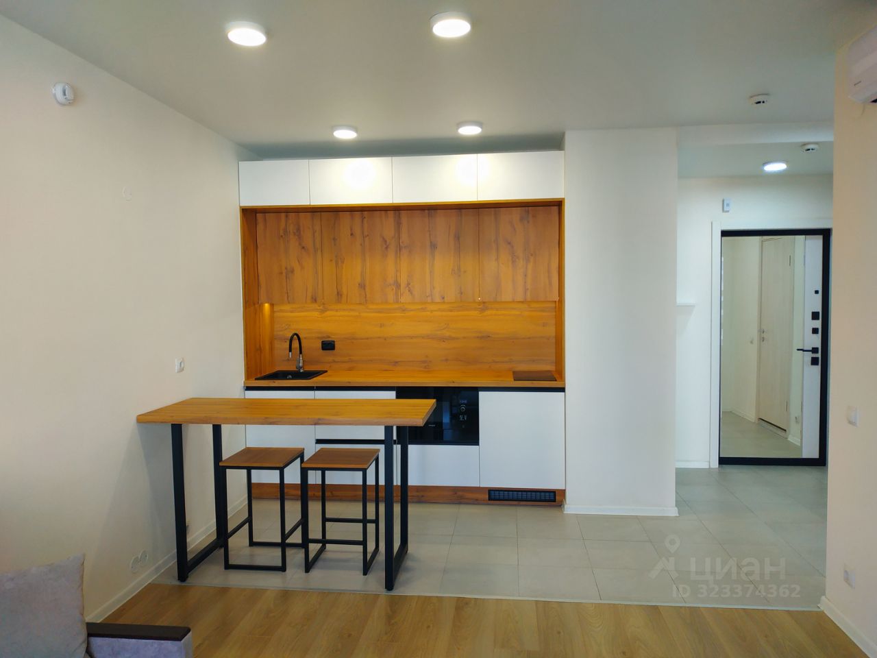 Стильный, большой, вместительный кухонный гарнитур, одновременно не занимающий много места, с современной техникой. Барная стойка, которая увеличивает рабочую поверхность для готовки аж до 3-Х МЕТРОВ!
